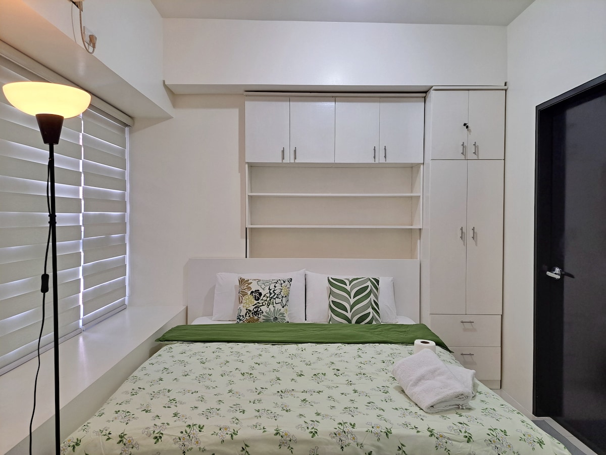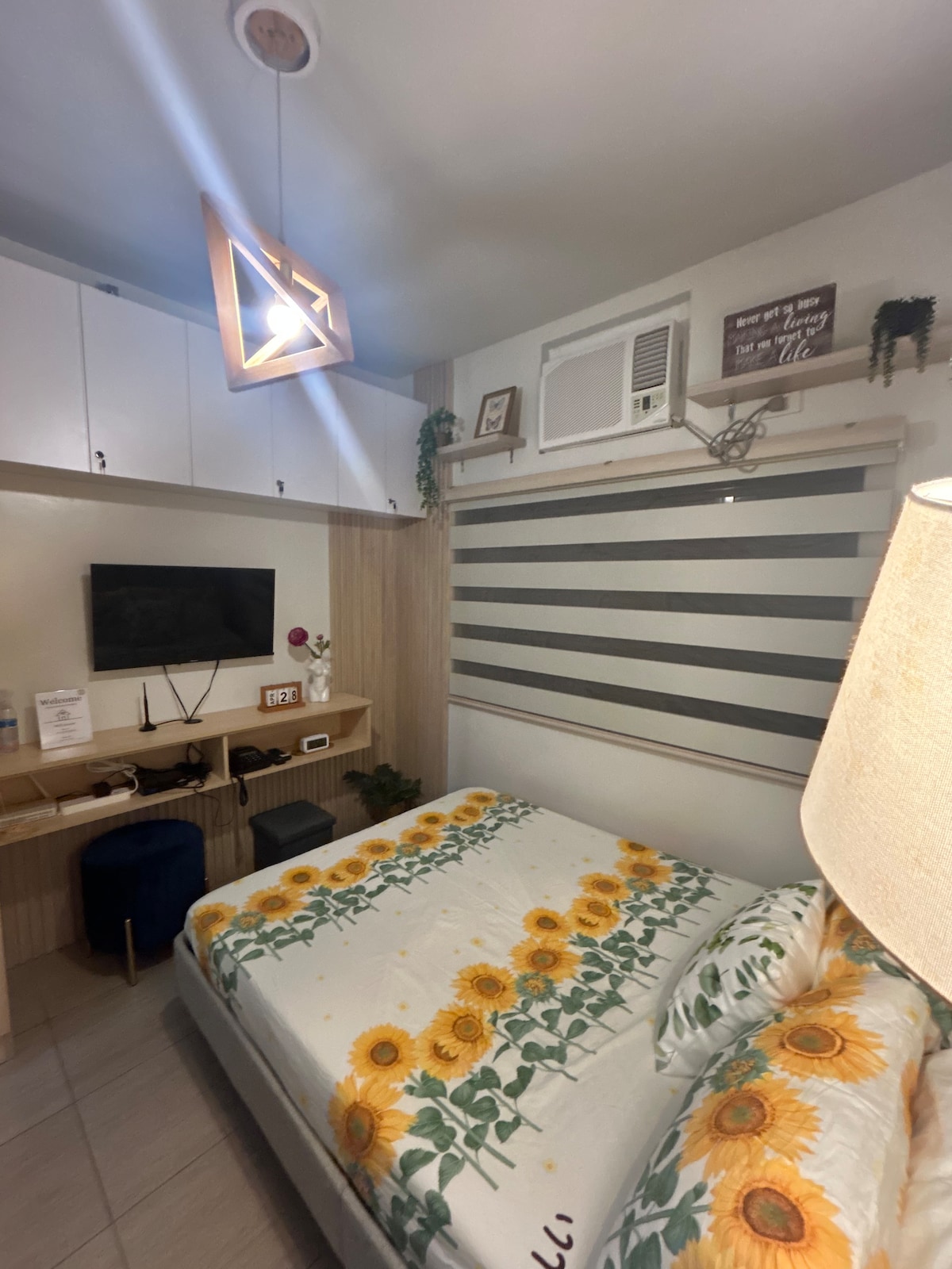 Take a break from the city within the city ON A BUDGET. If you are looking for a place to spend time with your loved ones without moving out of the Metro, this is the perfect place to be. Feel the breeze of fresh air upon entering the gate as you will be welcomed by pine trees giving you cool vibes of Tagaytay and Baguio. The unit features a balcony, laundry area, kitchenwares, 50" Smart TV, a king size bed and other amenities you need for your full staycation experience.