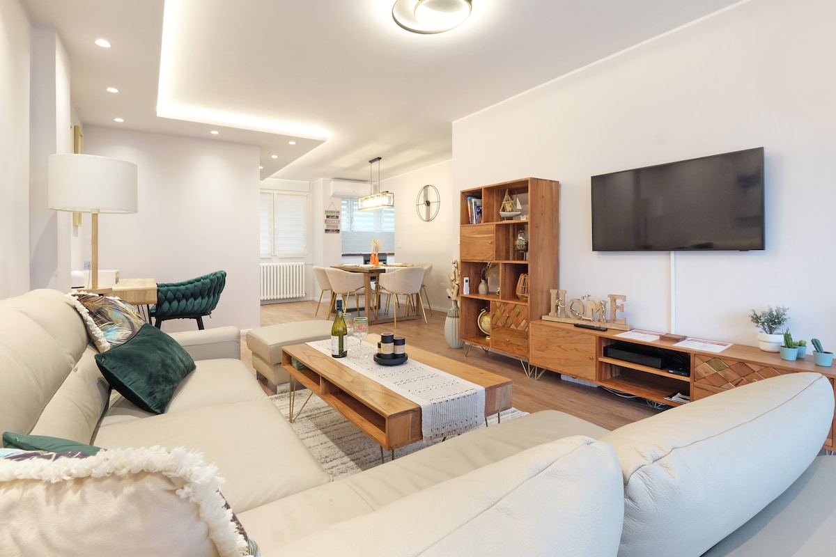 平均评分 5 分(满分 5 分),共 24 条评价宽敞现代5*加大双人床和沙发床,带车库停车位
