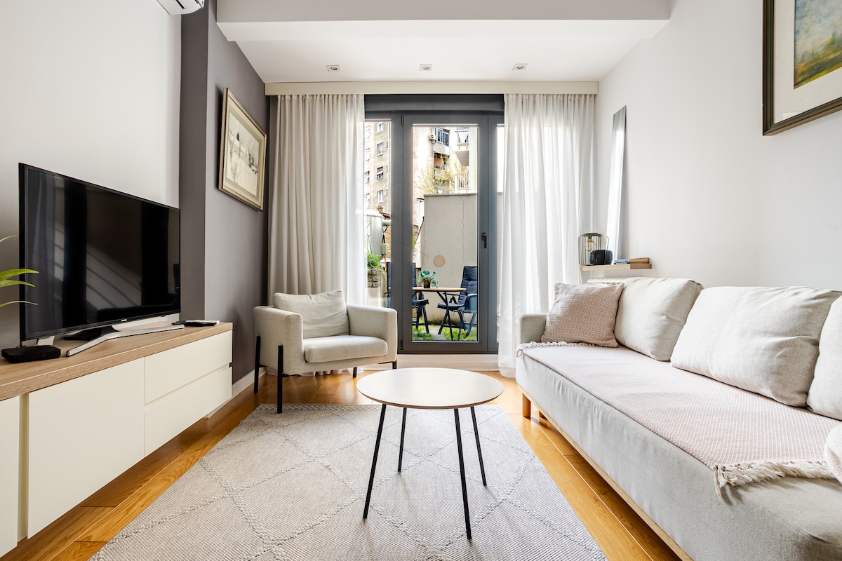 Bright Apartment in walking distance of the Sava Center, Arena and Usce. Well connected to the Belgrade City Centre by public transport (10 mins). Beautiful and spacious terrace and all amenities for your comfortable stay. Parking spaces, grocery shops, a bakery, a pharmacy and a coffee shop are nearby. 15 km (17 minutes) from the Nikola Tesla Airport 1,8 km (7 minutes) from the Central bus Station New Belgrade. If you need any additional information, don't hesitate to contact me. Welcome!