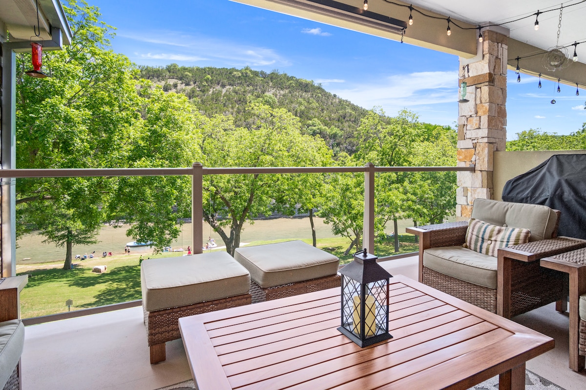 PRIVATE COMAL RIVER ACCESS. This fully updated rustic 2 bedroom, 2 full bath, double balcony retreat offers elevated beautiful views of the Comal River and surrounding park. Custom pecan wood trim throughout, designer tile floors, granite island/countertops, large walk in shower, new appliances, Chuckwagon dining table, mounted tvs in living room and both bedrooms, comfy beds & linens make this condo the ultimate spot for your Texas hill country vacation.
