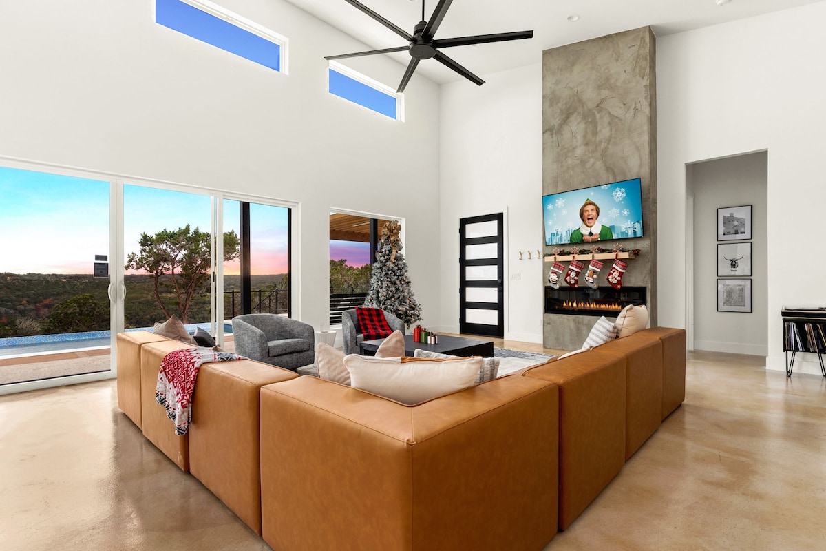 Want to feel as though you're staying in the mountains, but remain local to Texas? This is the spot for you. As you enter the property, you will drive up a hill that winds around a forestry of trees surrounding the property. At the top of the hill, you will be greeted by a modern home towering over the trees to provide an unforgettable view that overlooks rolling hills as far as you can see. It is truly a magical experience offering rest from the daily grind of normal life.