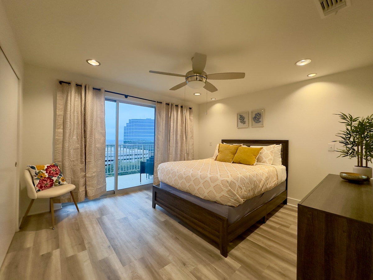 Discover romance and modern elegance in our Enchanting Studio, perfectly situated near The Rim and Six Flags. Ideal for couples or family with small kids, it features a luxurious king bed set against a vibrant decor of red, black, and yellow, framed by a sleek black theme. Enjoy premium amenities including a stunning outdoor community pool perfect for sunset views, a 24-hour fitness center, a study room, and a conference center. This is your perfect getaway for relaxation or an exciting vacation