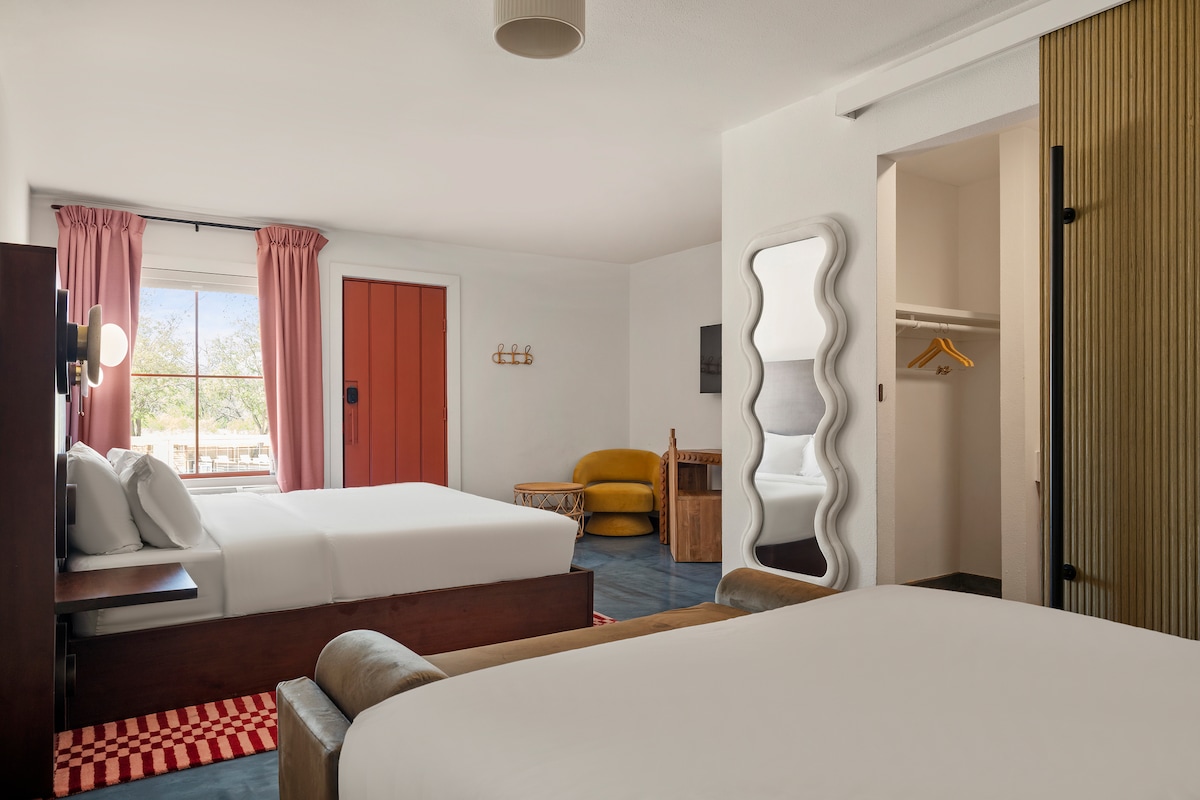 One king, one queen, no compromises. This room is made for travelers who like options, whether you’re a family, a duo who prefers their own sleep space, or a group that’s just better with a little extra room. It’s got the same relaxed charm as our other Deluxe rooms, with a desk for planning or posting, a rainfall shower, and all the practical perks: microwave, mini-fridge, electric kettle, and a stash of complimentary tea and coffee. Easy, flexible, and all yours.