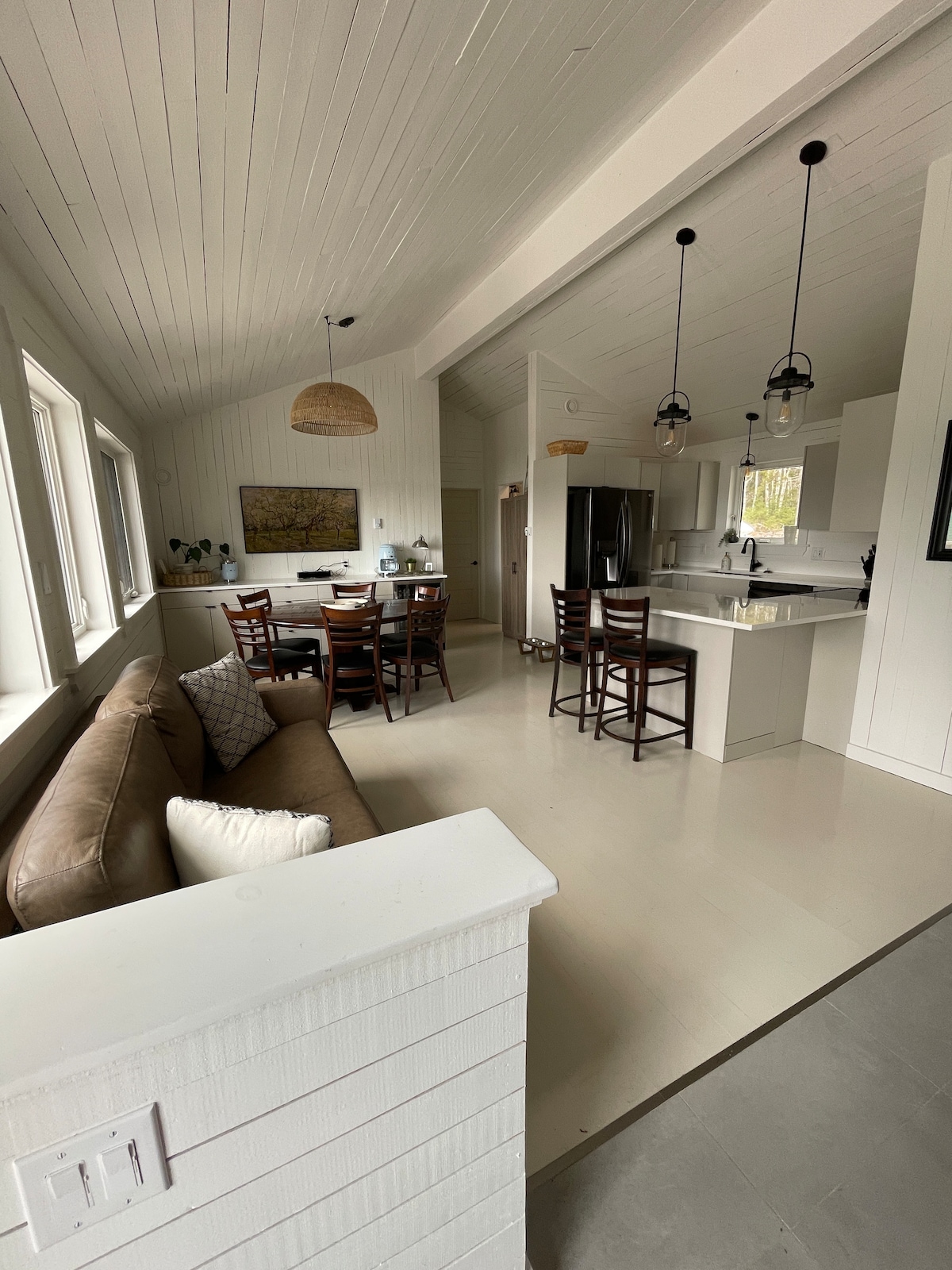 A spacious 2-storey chalet (1300 sq ft per floor) offering stunning panoramic views of the Gulf of St. Lawrence. Enjoy a private trail to the shore, direct access to the QuadNB trail, a spa on the terrace overlooking the ocean, and pellet stoves for a warm, cozy atmosphere. Includes a unique 3 km sea-to-land snowshoe loop. A peaceful 4-season nature escape to relax, recharge, and explore the beautiful Acadian Peninsula.