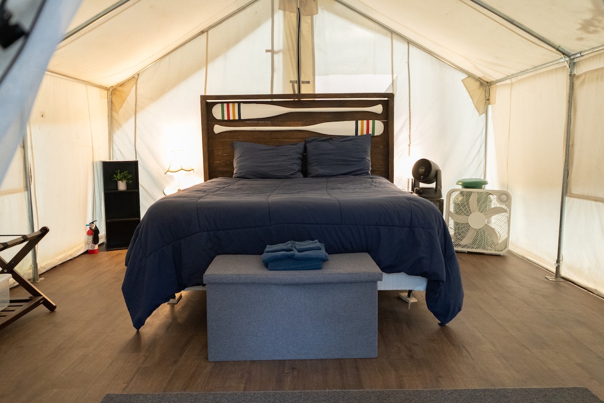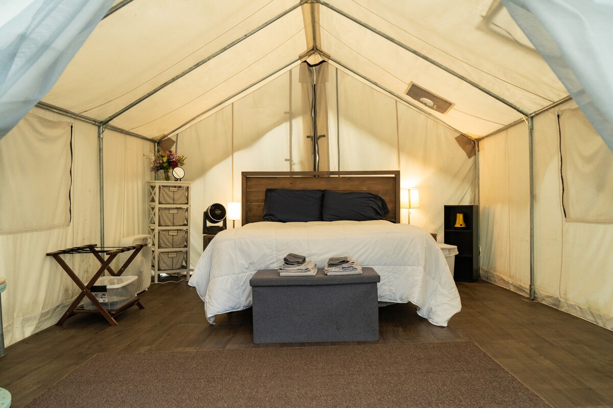 Our Safari Tent has one queen-size bed and one toddler bed with pillow-top mattress and quality sheets, pine furniture, fan, electric lights, and an automatic pellet wood stove. There is a large raised veranda with outdoor chairs and a private enclosure with a portable toilet and sink. Additional bathrooms and showers are nearby. Hot tubs under the stars is available for you to schedule your personal time. Please note, guests must walk a short distance uphill to reach the glamping tents.