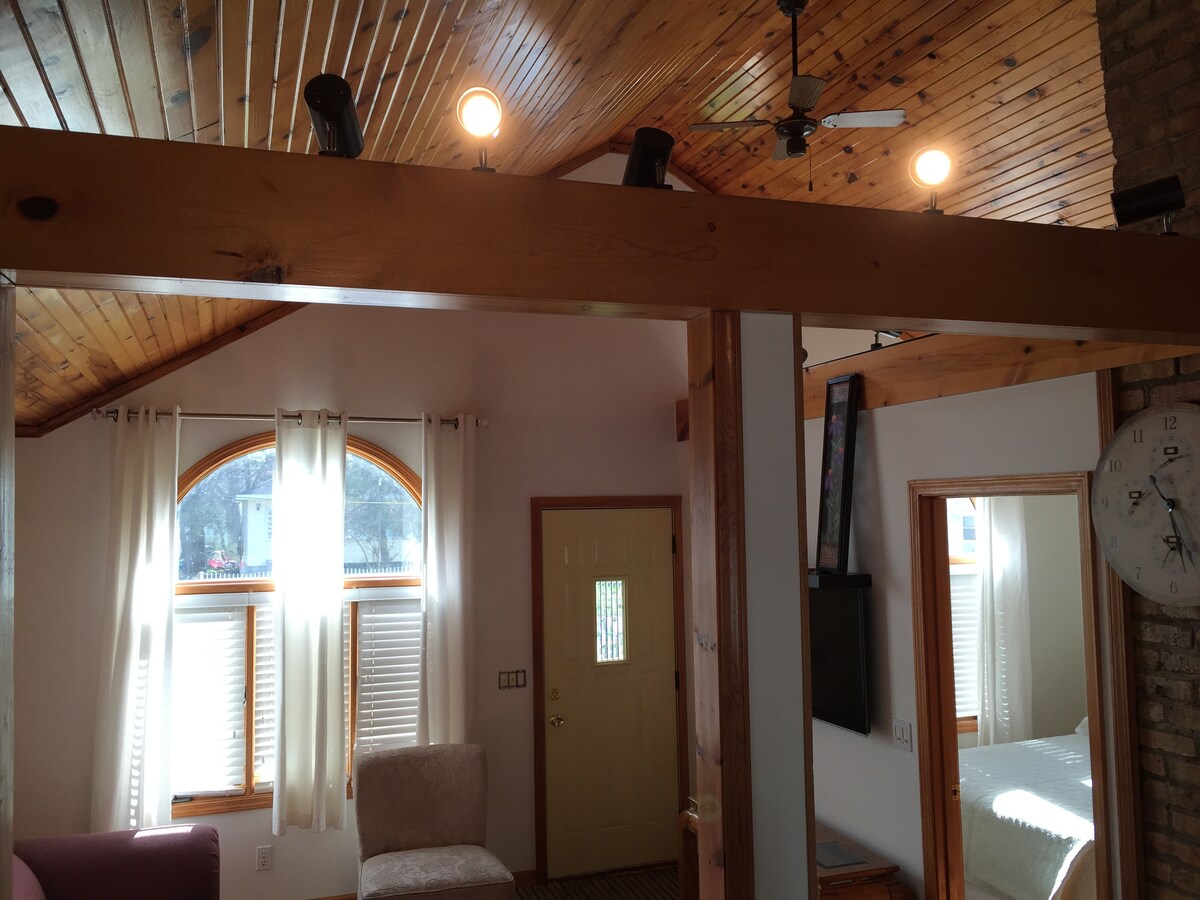 "Tiny House" guest house located under large oak trees near the beach, and not far from I-94 and the Michigan state line. Vaulted ceiling, open feeling. Light and bright décor. Full bathroom, comfy couch, and other amenities. Polished concrete floor, whitewashed shiplap ceiling, hand-crafted oak furniture, suspended shelving. High ceilings, windows with southern exposure, front porch with siting chairs and a grill. Convenient charger for electric cars. Never a cleaning fee.