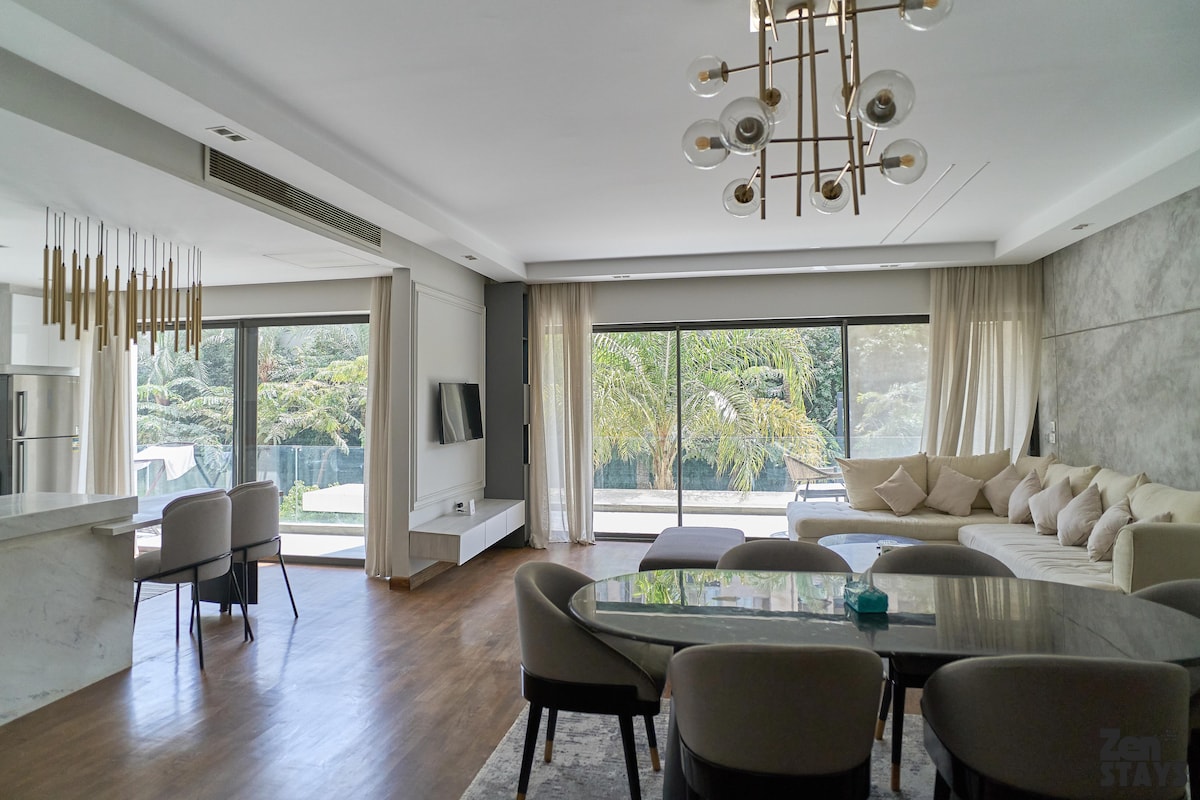 تبدو وكأنها وحدة خرجت للتو من مجلة للتصميم الداخلي، أليس كذلك ؟ هل يمكنك تخيل التواجد في واحدة من تلك الوحدات ؟ الآن أصبح الأمر حقيقة واقعة. جناح فاخر مفروش فرش فندقي بحديقة خاصة لك وحدك مزود بجميع وسائل الراحة نعمل علي استقبالك بشكل احترافي وتحقيق اقامتك الفندقية. قريب جدا من مجمع كامل من مطاعم وكافيهات وبراندات عالمية قريب من مول بوينت 90 - شارع التسعين تم الاعتماد على البساطة في هذا المسكن الهادئ والاستراتيجي. حي اسكان الجامعة الامريكية من ارقي أحياء التجمع 5 - يتميز بمستوى معيشة راقي