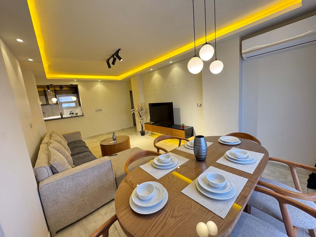 Experience modern boho luxury in this brand-new (Oct 2025) apartment located in the prestigious West Golf Extension, New Cairo — just minutes from 5A Walkway, Cairo Festival Mall, and Katameya’s vibrant spots. Enjoy presidential master bedroom, 4 Smart TVs, concealed A/C, electric shutters, and all-new appliances in a bright, elegant space. Perfect for guests seeking comfort, style, and an upscale Cairo experience.
