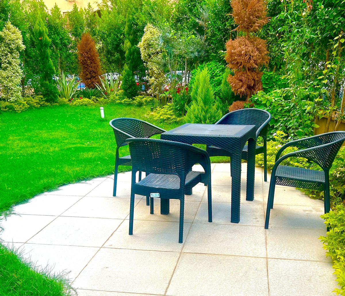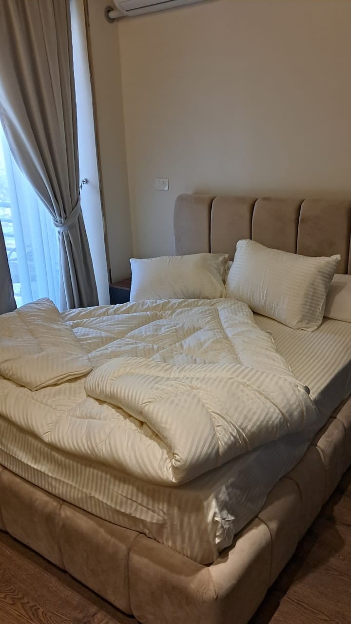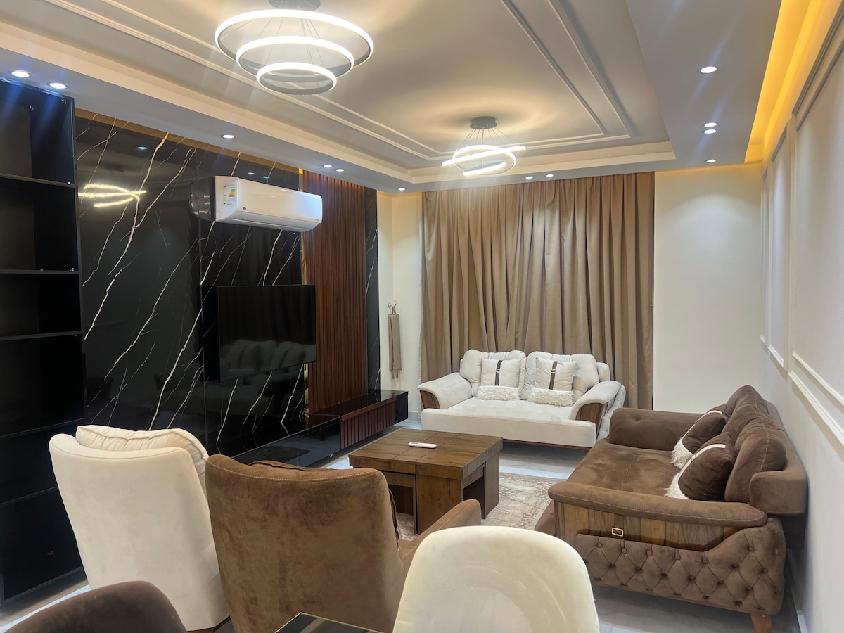 A private apartment in the most prestigious areas of the Fifth Settlement in New Cairo, a full bedroom, a large bed, a wardrobe, a reception, an American kitchen, a bathroom, the apartment is covered with Wi-Fi, and it has a private garden with a large grill and an umbrella, and the apartment is in a privileged location with easy access to any area within Cairo