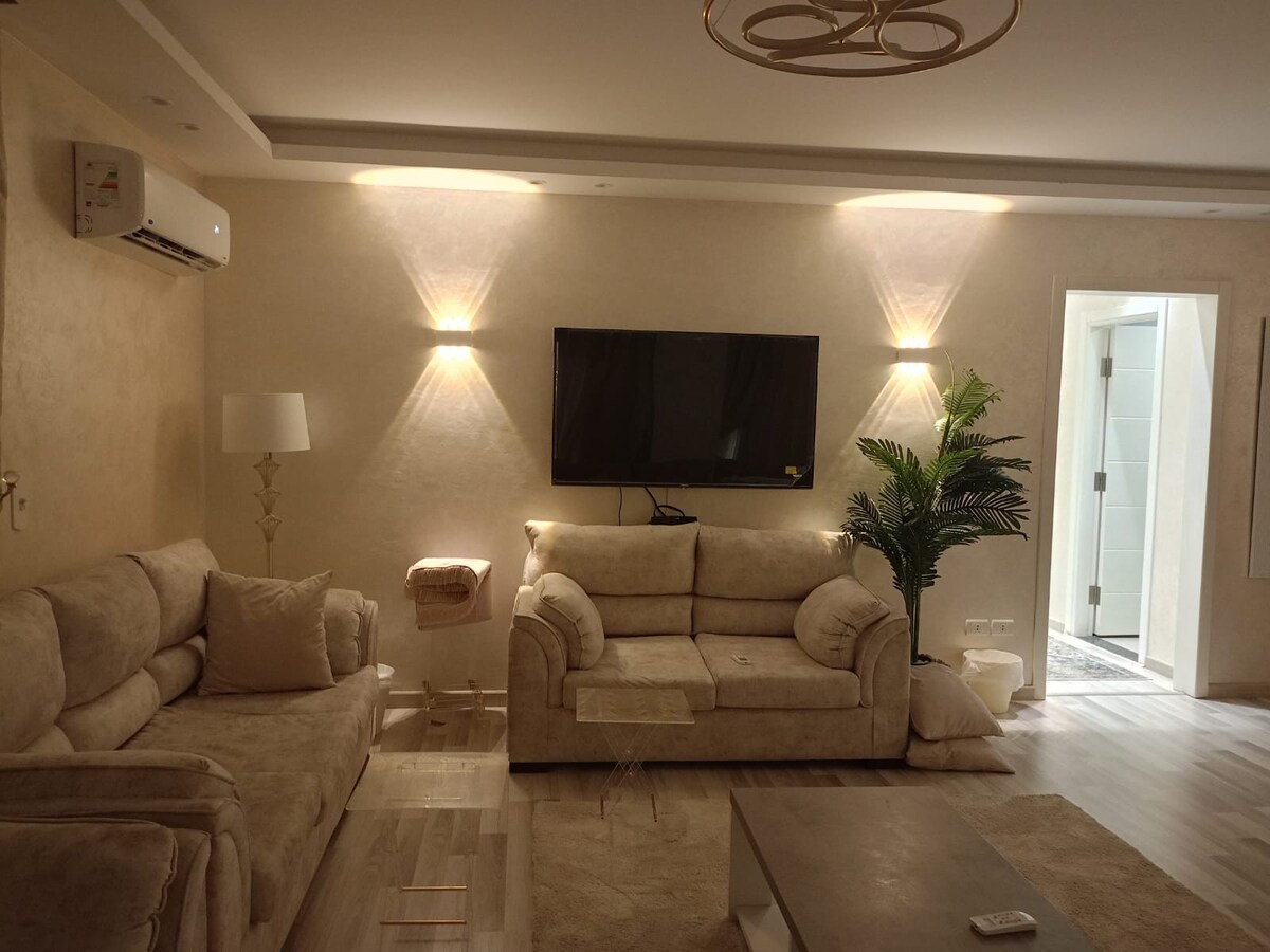 Enjoy a stylish experience at our centrally-located penthouse, in the heart of New Cairo. Very close to Cairo Festival City, 5A by Waterway mall, shopping malls, restaurants, and RingRoad. We love to stay at places that respect privacy and good energy, that's what you'll feel when you enter the house. You will enjoy the fresh air at the roof with warm lighting and cozy sitting, and you'll find peace inside the house with all brand new furniture, coffee machine, smart TV and full AC
