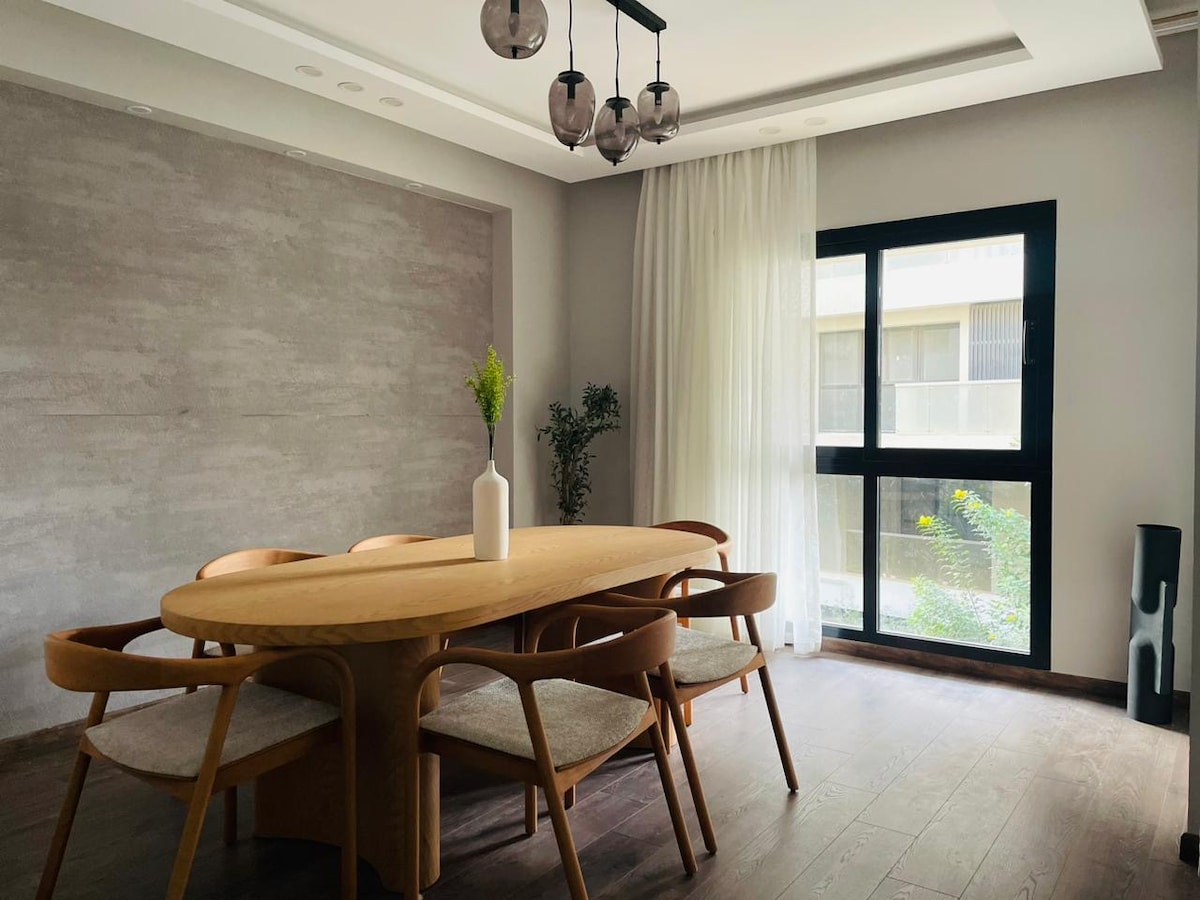 Stylish Two-Bedroom Apartment with Garden View Enjoy a comfortable stay in this beautifully furnished two-bedroom apartment. One bedroom is a master suite with a private dressing area. The apartment features two modern bathrooms, a fully equipped kitchen, a spacious reception area, and a balcony overlooking a lovely garden view. The unit is finished with high-quality hotel-style furniture, offering both comfort and elegance—perfect for families or business travelers seeking a relaxing stay.