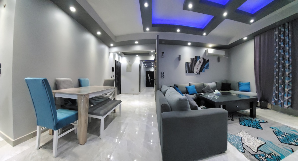 Our modern penthouse with a private pool is perfect for families seeking convenience and luxury. Located in a gated community in the upscale area of New Cairo, just 30 minutes from the airport, and close to amenities like KFC, Starbucks, and a variety of Western and local restaurants (Chili's, Fuddruckers, LongHorn Texas, Ibn Al Sham). Amenities like a King Bed, washer, dryer, dishwasher, and microwave ensure comfort, and 4 smart TVs provide entertainment.
