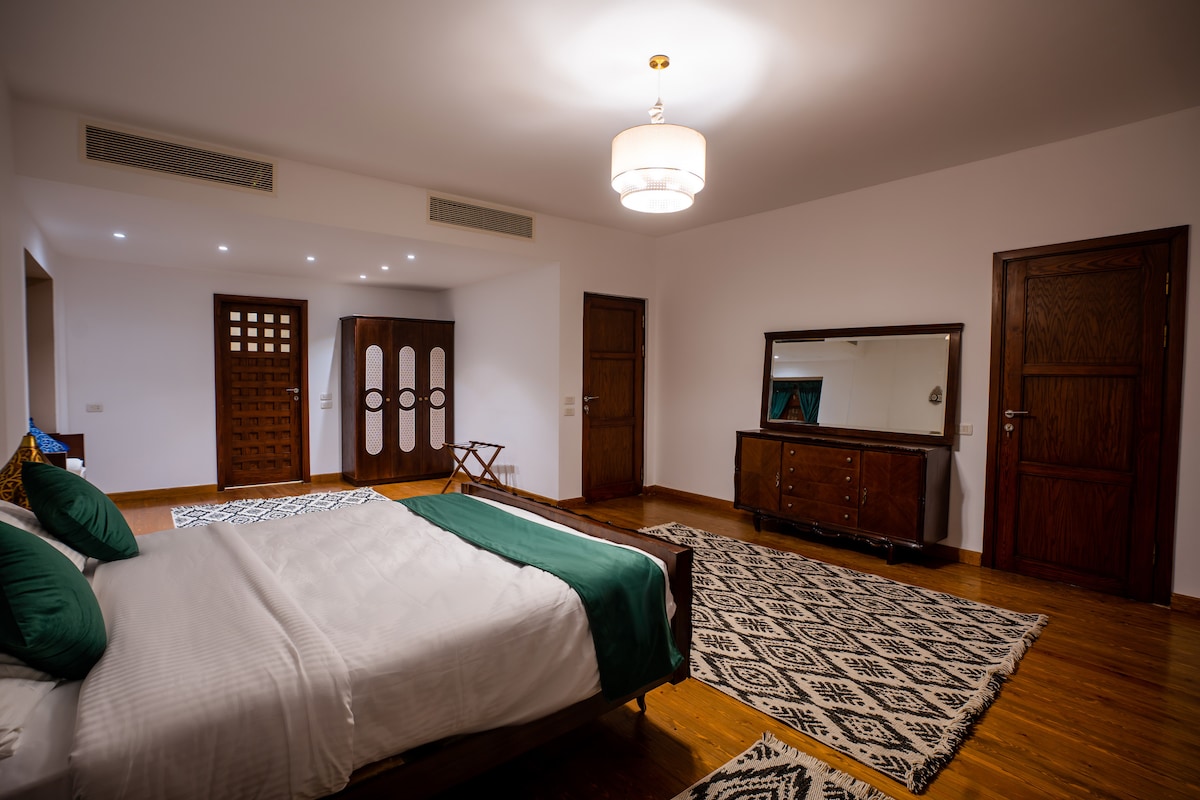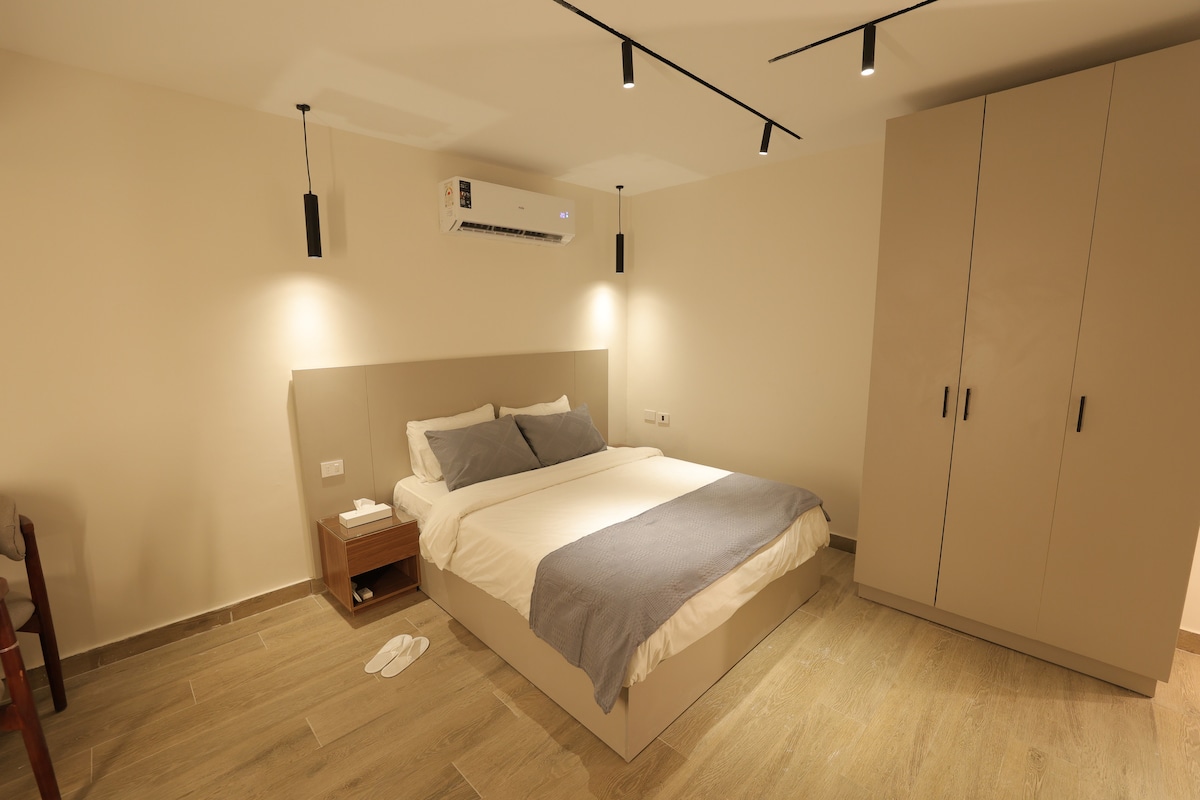 Experience premium comfort in this 5-star room at Nyoum New Cairo Tower, with a direct view of AUC. Fully serviced by Guave Stay, the space offers hotel-level amenities, exceptional cleanliness, and custom design tailored for high-quality guests. Every detail is curated for comfort, style, and a truly effortless stay.