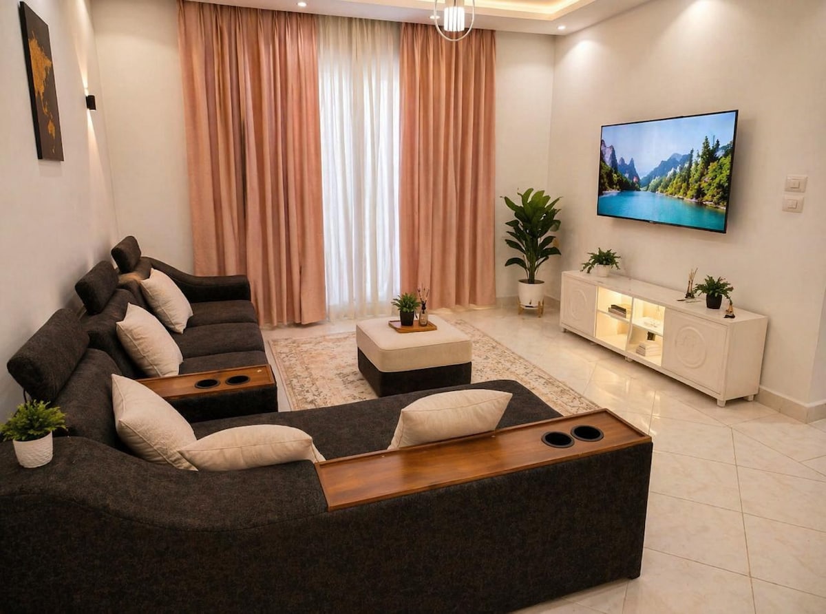 Experience luxury in this 3-bedroom apartment in a 24/7 secure compound in New Cairo--25 mins from the airport. Features a master bedroom, smart TVs, high-speed Wi-Fi, and premium furniture with luxury dinning set. Enjoy a shared pools, green spaces, and beautiful views. Close to top malls, cinemas, restaurants and everything you need. Perfect for families or business stays, book your stay now