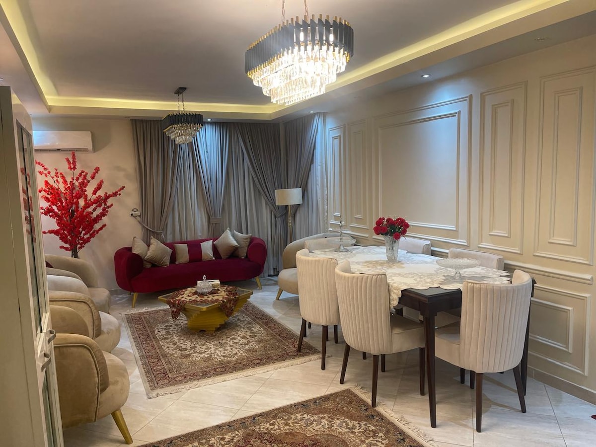 Experience luxury in this 3-bedroom apartment in a 24/7 secure compound in New Cairo--25 mins from the airport. Features a master bedroom, smart TVs, high-speed Wi-Fi, and premium furniture with luxury dinning set. Enjoy a shared pools, green spaces, and beautiful views. Close to top malls, cinemas, restaurants and everything you need. Perfect for families or business stays, book your stay now