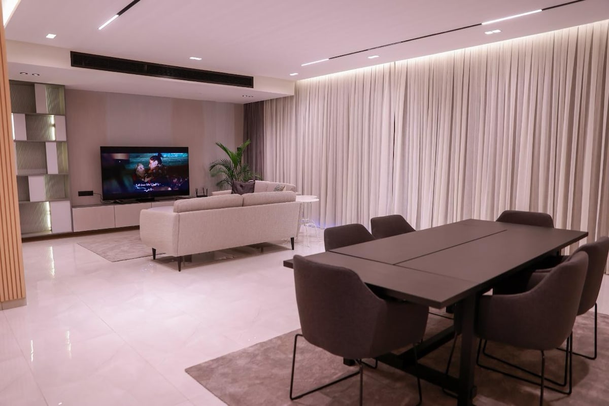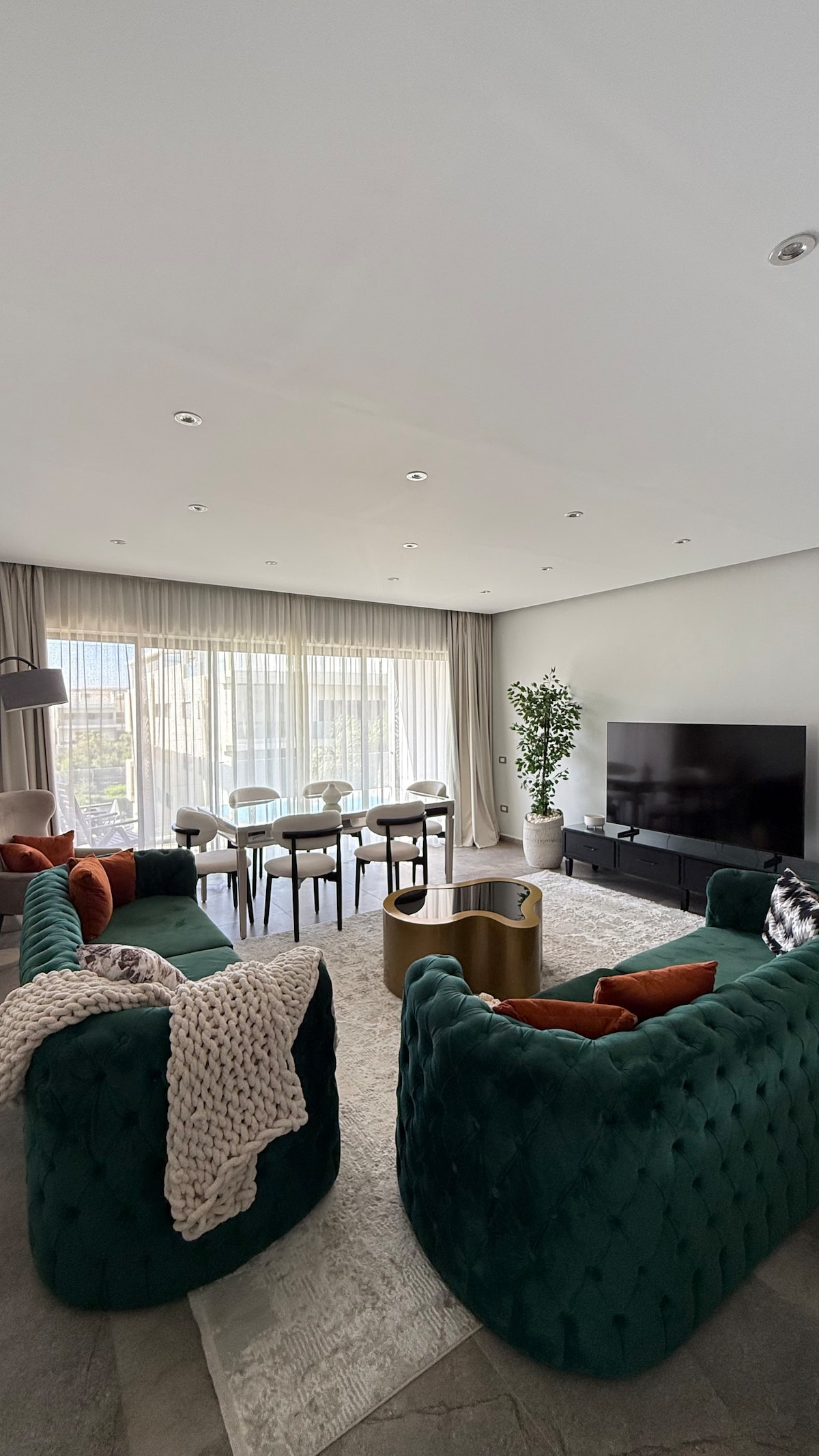 Experience luxury in this 3-bedroom apartment in a 24/7 secure compound in New Cairo--25 mins from the airport. Features a master bedroom, smart TVs, high-speed Wi-Fi, and premium furniture with luxury dinning set. Enjoy a shared pools, green spaces, and beautiful views. Close to top malls, cinemas, restaurants and everything you need. Perfect for families or business stays, book your stay now