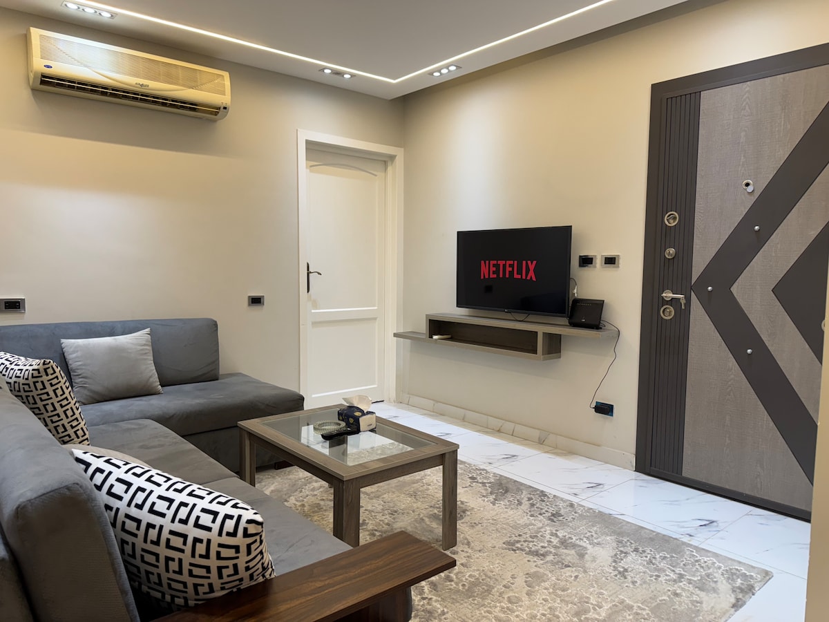 Welcome to my lovely Charming Luxury apartment! My Apartment located in Luxury safe Compound with very good wide Garden and Kids Area. Enjoy modern elegance 2 Bedroom , complete AC, and comfort. Stylish living area, fully equipped kitchen. You'll love the stylish décor and cozy atmosphere, which makes it the perfect home away from home. *High-speed internet. *10 mins to City Center Almaza Mall *15 mins Cairo Festival Mall *15 mins to Airport Book now for a delightful stay!