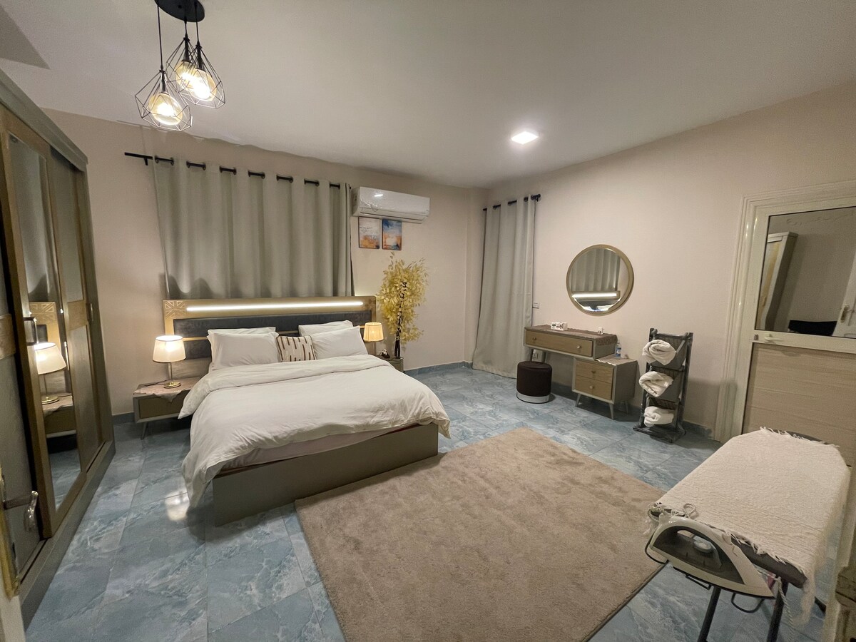 Escape the hustle and bustle of the city and unwind in this tranquil 90-square-meter open-layout studio. Enjoy spacious living, a comfortable king-sized bed, and an unmatched fully equipped kitchen. Location: Just a 5-minute drive from AUC, The Spot Mall, and Point 90 Mall, 25 Minutes from Cairo Airport Message me for more details or book your stay instantly. I can help you with planning your trip, recommending authentic Egyptian restaurants, or guiding you to the hidden gems of the city.