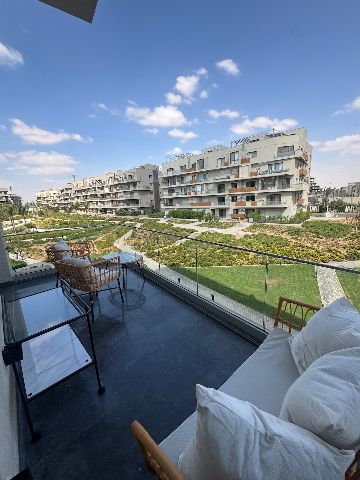 Spacious and serene, this 2BR apartment offers lush garden views, a large outdoor lounge area, and access to a shared pool. The master bedroom is airy and bright, while the second room has a balcony overlooking the street. You'll find a full guest bathroom in addition to the ensuite, ideal for privacy and comfort. Located in a secure New Cairo compound near top cafés, malls, and dining. Enjoy peaceful mornings outside and cozy nights in—this is city living with a garden soul.