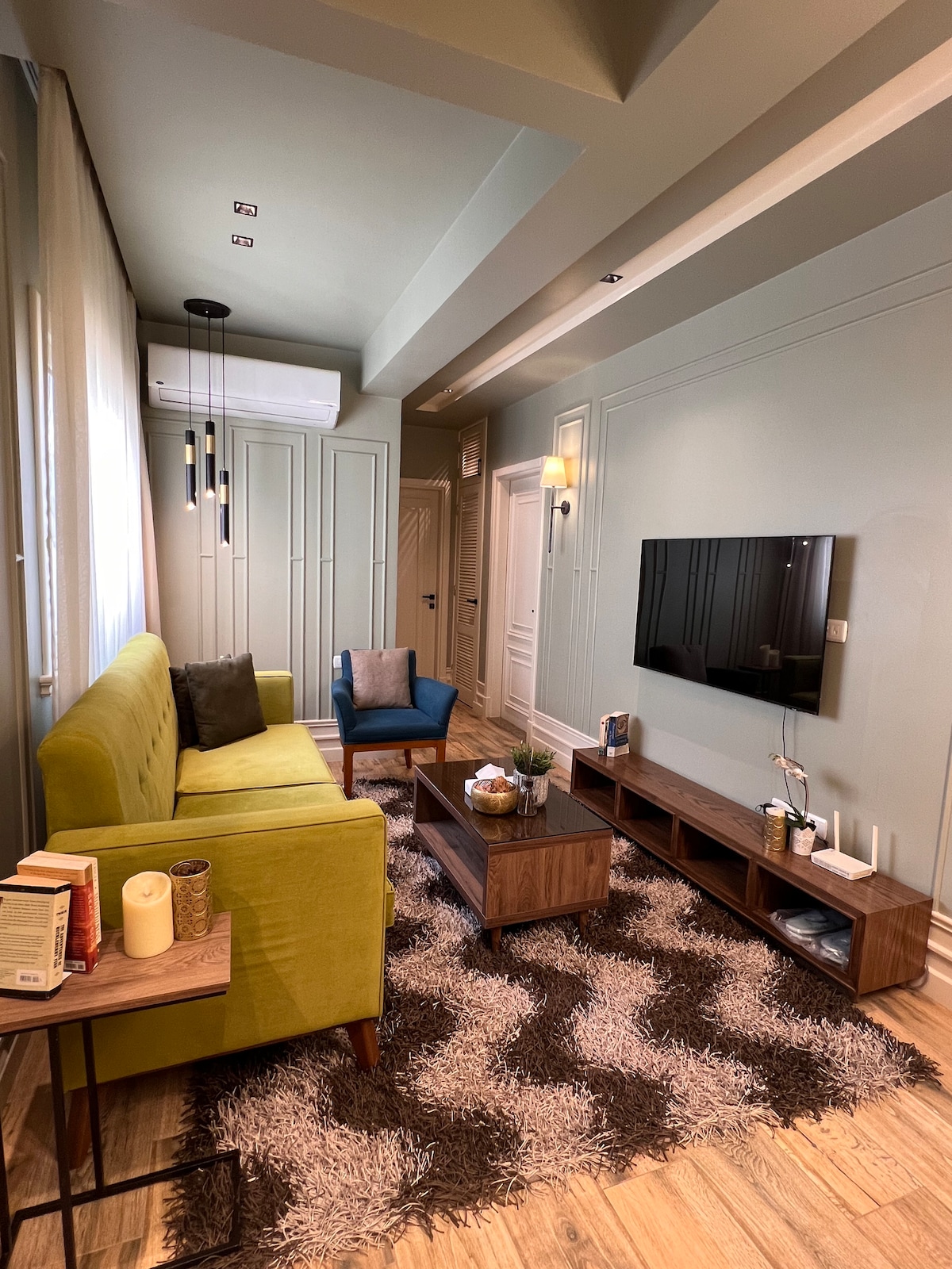This unique place has a style all its own. The 1 bedroom apartment includes a spacious reception area with a living that includes a bright outdoor balcony. There is a fully equipped kitchen, cooking utensils and a Nespresso coffee machine. The living room is furnished with a convertible sofa to bed SO the apartment may suitable for 3 persons ,50inch smart TV with AirPlay built-in for further personal entertainment. There is 1 bathroom. The bedroom includes two single beds OR one king-bed.