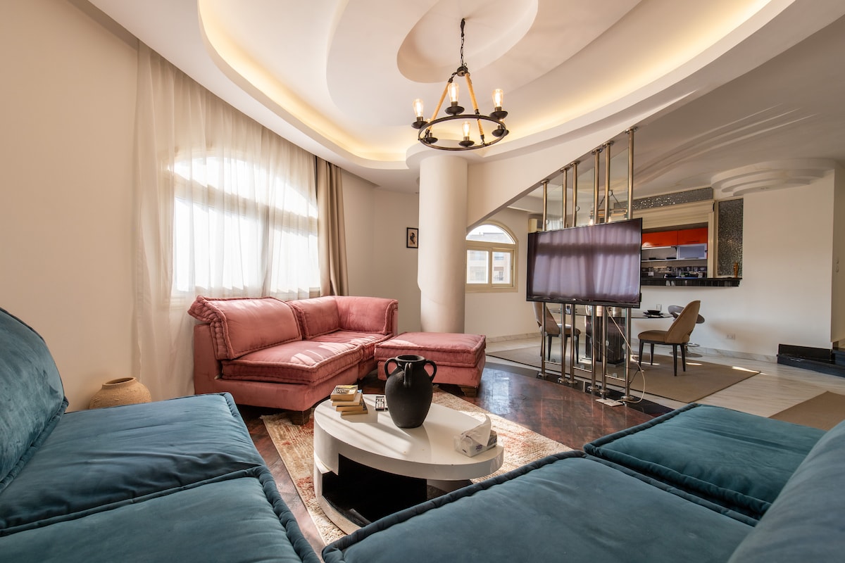 Welcome to our luxurious and warm duplex! This unique and spacious artistic retreat features four bedrooms, two of which have ensuite bathrooms. Nestled in the heart of New Cairo, one of the most upscale areas—Gharb el Golf – West el Golf Katameya—it offers a prime location with proximity to Katameya Heights, renowned for its golf course, bars, and restaurants