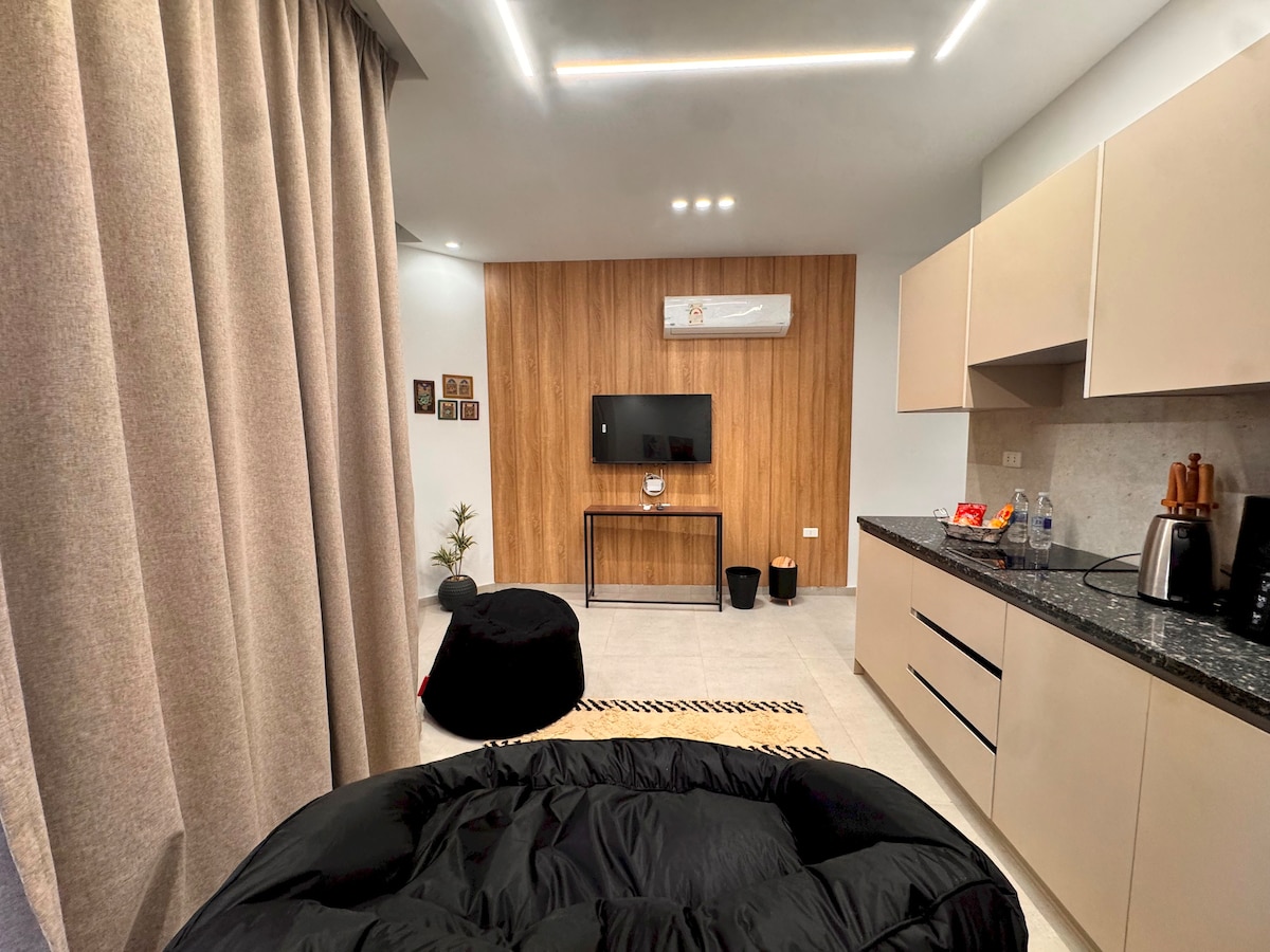 Escape the hustle and bustle of the city and unwind in this tranquil 90-square-meter open-layout studio. Enjoy spacious living, a comfortable king-sized bed, and an unmatched fully equipped kitchen. Location: Just a 5-minute drive from AUC, The Spot Mall, and Point 90 Mall, 25 Minutes from Cairo Airport Message me for more details or book your stay instantly. I can help you with planning your trip, recommending authentic Egyptian restaurants, or guiding you to the hidden gems of the city.