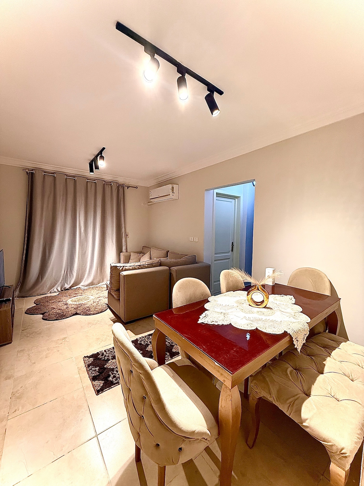 Welcome to our stylish ground-floor studio in New Cairo. Discover comfort in our spacious, well-equipped apartment, ideal for long-term stays. Immerse yourself in a home-away-from-home experience. Enjoy modern amenities and a shared laundry room. Short distance to key landmarks like the Airport (23km), Cairo Festival City Mall (5.7km), Downtown Mall (5.3km), Bank District (4km), and 5A Waterway Mall (2.8km). Perfect for solo or a couple travelers. Your perfect stay awaits!