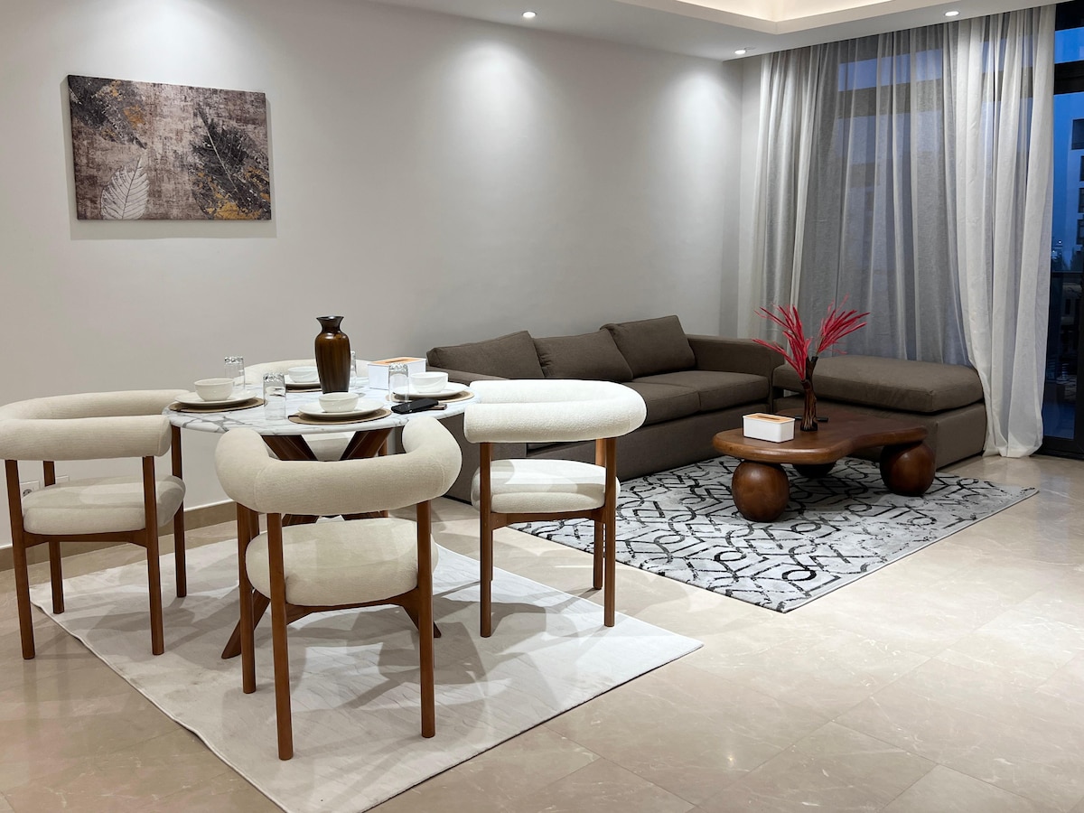 Stylish Two-Bedroom Apartment with Garden View Enjoy a comfortable stay in this beautifully furnished two-bedroom apartment. One bedroom is a master suite with a private dressing area. The apartment features two modern bathrooms, a fully equipped kitchen, a spacious reception area, and a balcony overlooking a lovely garden view. The unit is finished with high-quality hotel-style furniture, offering both comfort and elegance—perfect for families or business travelers seeking a relaxing stay.