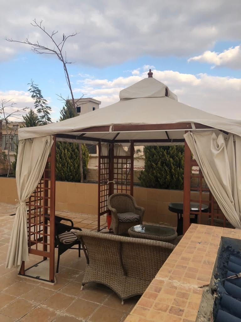 Have fun with the whole family at this stylish place,Standalone Villa in New Cairo, It is close to all the malls and tourist places and close to all the main axes. Decent compound with all the services, Private swimming pool and modern furniture, Consists of a ground, first and second floor. Four rooms, including a main room with a bar and seperate living space, dressing room, and Jacuzzi, barbecue, private garden. It has four bathrooms and overlooks a wonderful view and enjoys complete privacy.
