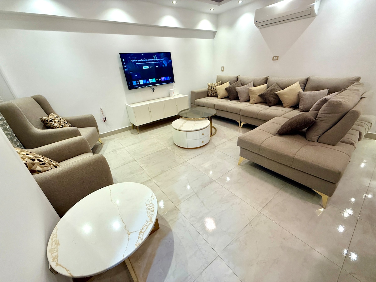 An ENTIRE APARTMENT with a back garden situated in a beautiful and green area in a peacefully integrated community fulfilling all residents' needs. Rooms are newly furnished, air conditioned, smart T.V. and all amenities you might need, super CLEAN and QUIET. The apartment is 25 minutes from Cairo intInternational Airport. coffee shops, restaurants, supermarkets, and pharmacies are all nearby. Hotel standard quality with home like comfort offered with a REASONABLE PRICED.