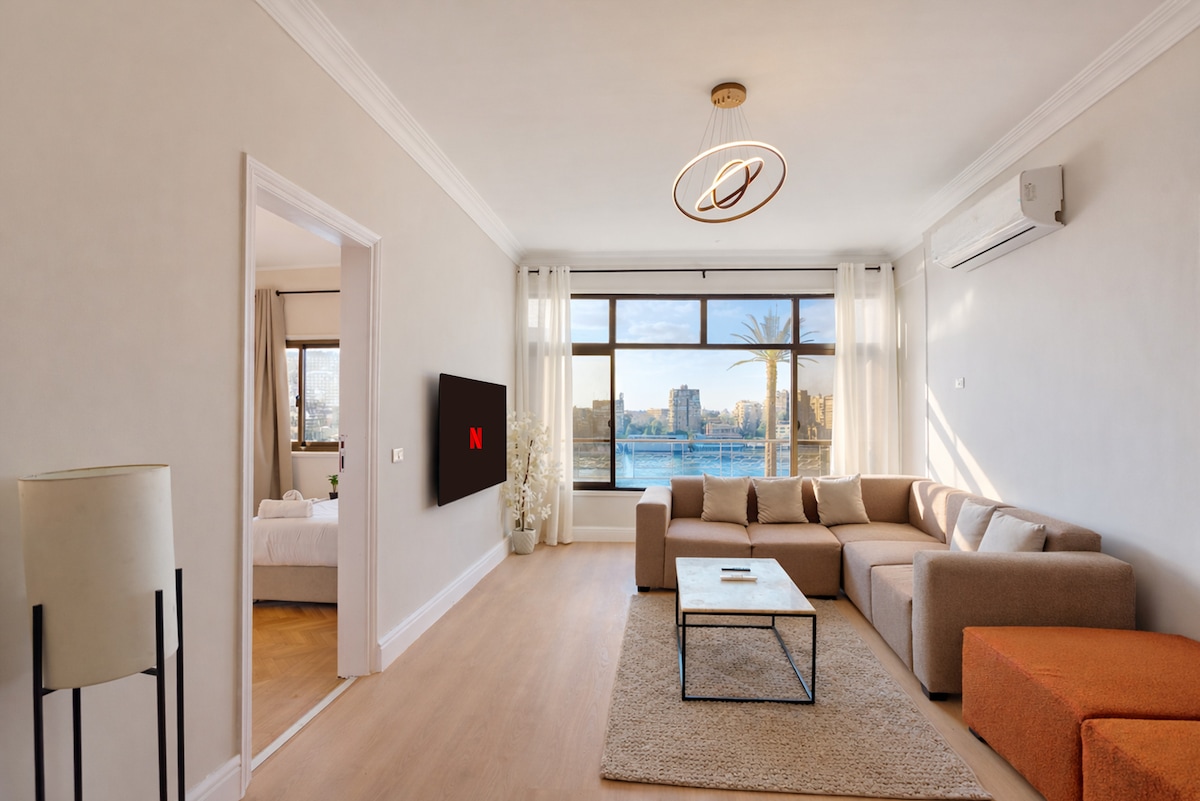 Nile & Pyramids View – Steps to Coptic Cairo & Museums! Wake to breathtaking Nile & Giza Pyramid views from your private balcony. This artistic 2-bedroom retreat features Mona Lisa art, a reading nook, Netflix, high-speed WiFi, AC, and a stocked kitchen with Nespresso. Easy self-check-in. Steps from supermarket. Minutes to felucca rides, Nile Taxi, St. Mary Church, Coptic Cairo, the Civilization Museum, & the Pyramids. Perfect for photographers, yogis, honeymooners, history lovers. ✨