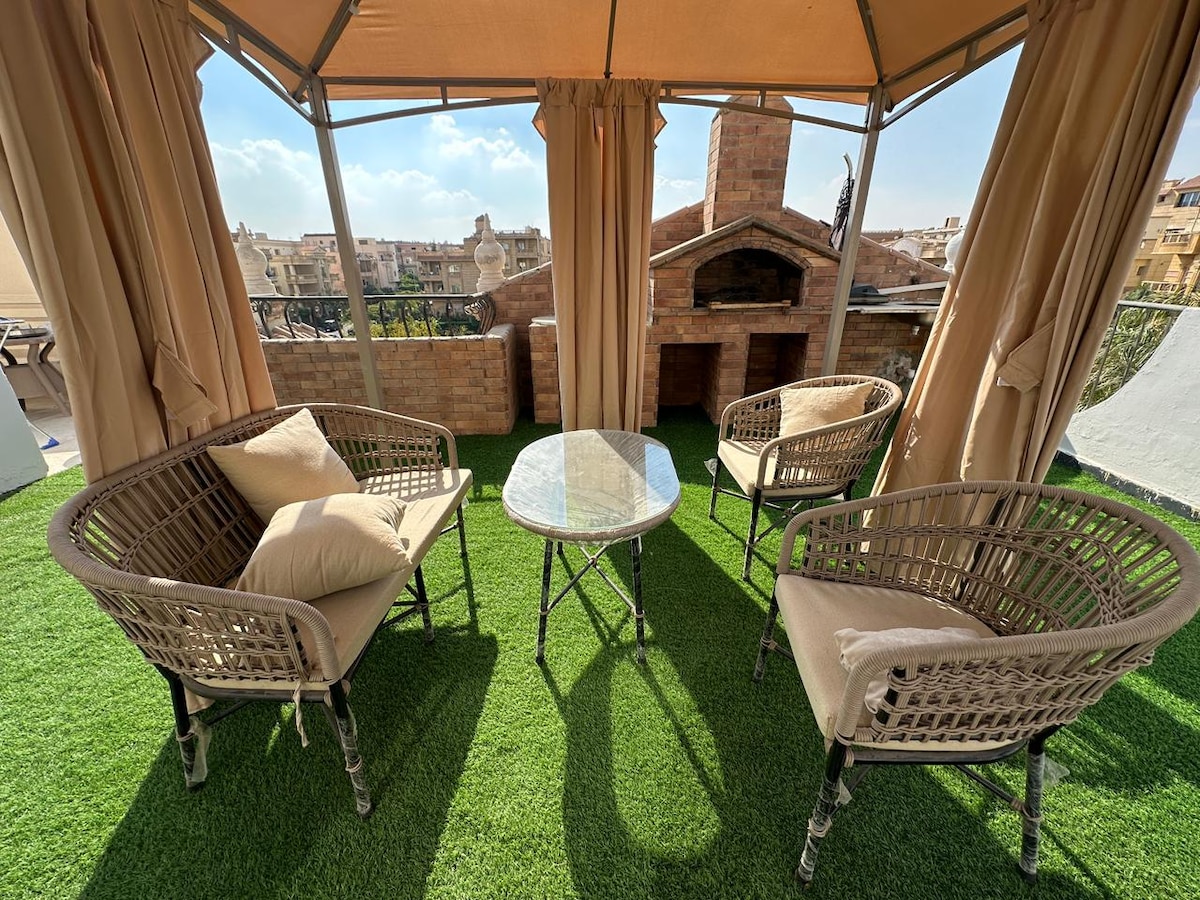 A cozy and modern private rooftop apartment in the heart of 5th Settlement, New Cairo, featuring a beautiful open view of gardens, sky, and stars at night. Enjoy total privacy, a spacious outdoor terrace with seating, swing chair, and grill, plus a stylish interior designed for comfort. Quiet, relaxing, and within walking distance to shops and daily needs—perfect for a peaceful stay with a great view.