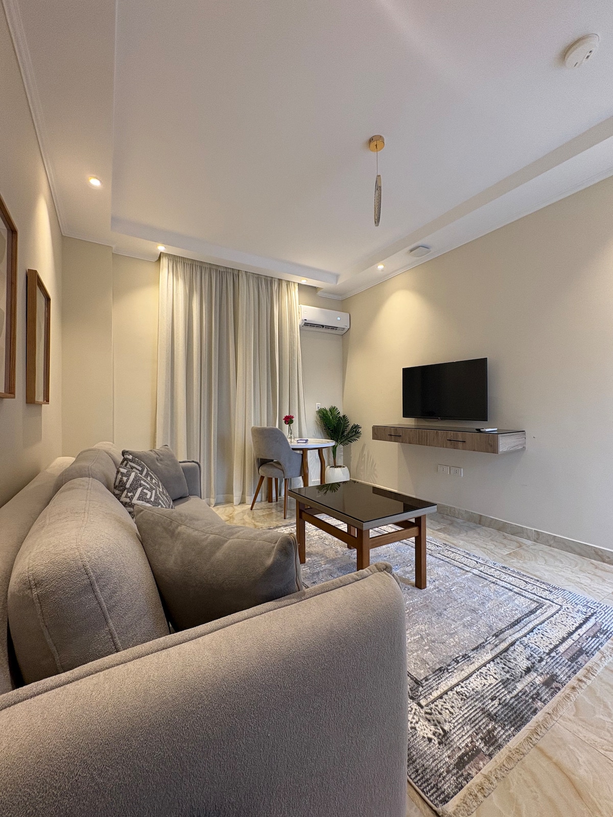 Welcome to our stylish 1-bedroom apartment: Message us for seasonal & special discounts. ●Bedroom (Queen size + sofa bed) ●Living room (smart tv + Couch) ●Dining area for 3 ●Sleek bathroom ●Fully equipped Kitchenette Located in the heart of the city, you'll be moments away from trendy cafés, vibrant nightlife, and top dining spots. ●WaterWay 5A, ●District 5 Marakez ●Uavenues ●The drive ●Katameya ●Garden 8 ●El Malahy ●CFC ●Arabella & many other venues. Contact us for more recommendations.