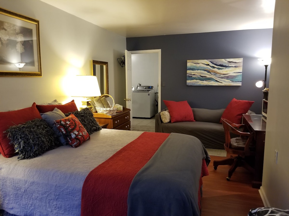 Enjoy this apartment with its own laundry , private entrance, parking for two cars. also features a private patio with a fire pit ,Just a short drive from historic Old New Castle, with its cafes, library, restaurants, . Enjoy a stroll along the Delaware River at Battery Park and discover all that this beautiful town has to offer Super convient location 3.4 Miles to Wilmington airport 27 Miles from Philadelphia Airport 8.6 Miles from Christiana Hospital 6 Miles to City of Wilmington and more.