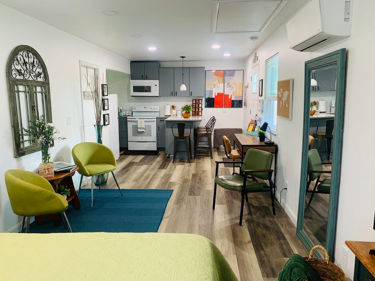 Relax in a stylish guest suite studio in a quiet, safe neighborhood. Its private entrance and parking for 2 vehicles makes the cozy space all the better. Enjoy the full kitchen, work space, high speed internet (1200mbps), 50” TV, full bathroom, and more. Perfect for the business professional on-the-go, or getaway. Take a stroll through White Clay Creek Park with your furry friend. Just a short 5 minute drive from Main St.'s restaurants, local bars, and UD. Only 10 minutes from Christiana Mall.