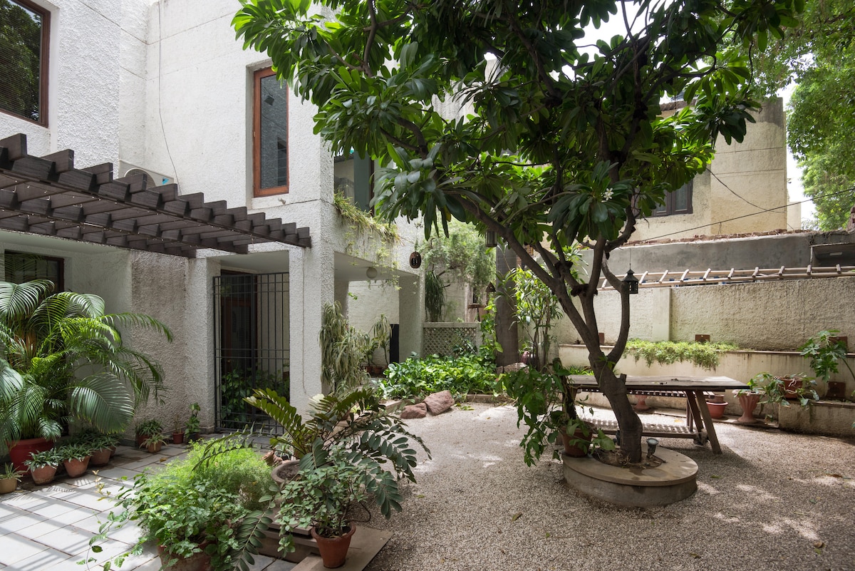 Self Check in available upon request Fully equipped private apartment with kitchen on split level overlooking terrace. Private terrace and balcony surrounded by lush greenery. Centrally located in a historic neighborhood in New Delhi. Private floor within a house shared with my family. Shared spaces include: laundry (at request) and gym equipped with dumbbells and free weights. Wifi included. Peaceful, well-lit, and walking distance to gardens, cafes, and heritage sites.