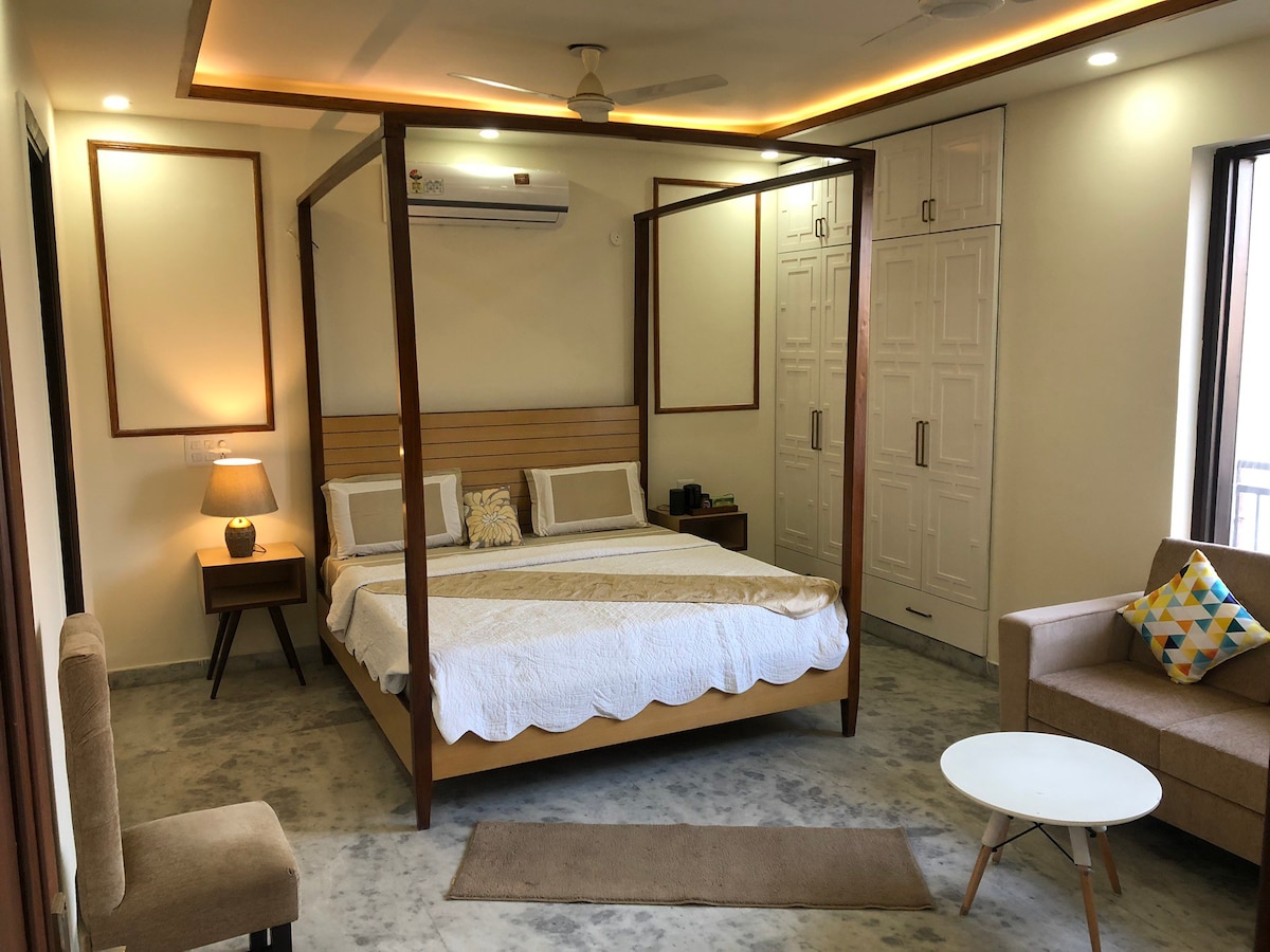 Standard AC room with external adjacent bathroom. This is part of an established bed and breakfast guest house in posh South Delhi, close to embassies, malls, AIIMS and all prominent places of Delhi. You get private AC room with independent entrance. Bathroom is private but adjacent to the room from outside next to the door. Breakfast is provided at an extra cost on per plate basis.