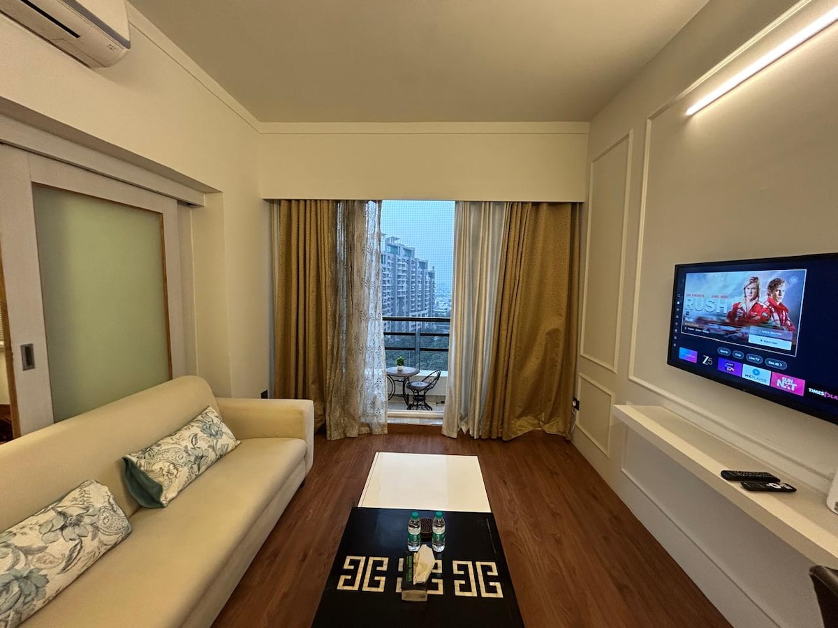 Stylish City Pad in Gurgaon's Heart! Escape to this beautifully designed apartment in Sector 49, blending urban charm with total comfort. Enjoy a cosy king-size bed, a full kitchen, a sleek bathroom, a workspace with Wi-Fi & a private balcony offering city views. ✦ Prime Location ✔ 20 mins from the IGI Airport & near DLF Cyber Hub, malls & cafes. ✦ Self Check-in & Hassle-Free Parking ✦ Roof Top Swimming Pool (IN4 499/+ Taxes per person) ✦ Ideal for romantic escapes, solo, or corporate trips.