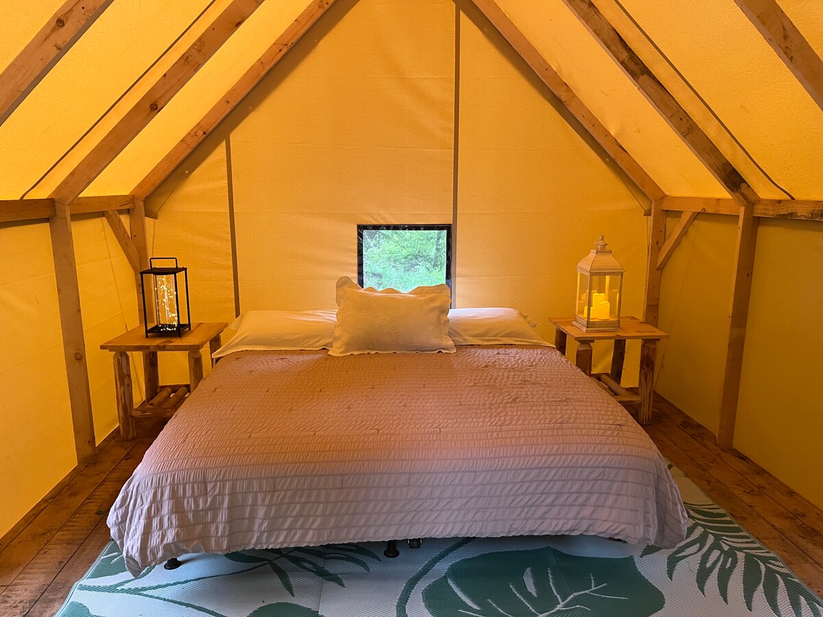 Enjoy the lovely setting of this romantic spot in nature. Sugar Brook Glamping provides the excitement of outdoor camping with the comforts to add absolute perfection to your camping experience. This oversized platform with canvas tent includes a private grill, your own fire pit and best of all you are a 3 minute walk to Basecamp common lounge to enjoy all the amenities such as 2 fully equipped bathrooms with walk in showers. We provide towels, body wash. Full kitchen, WIFI and more!!