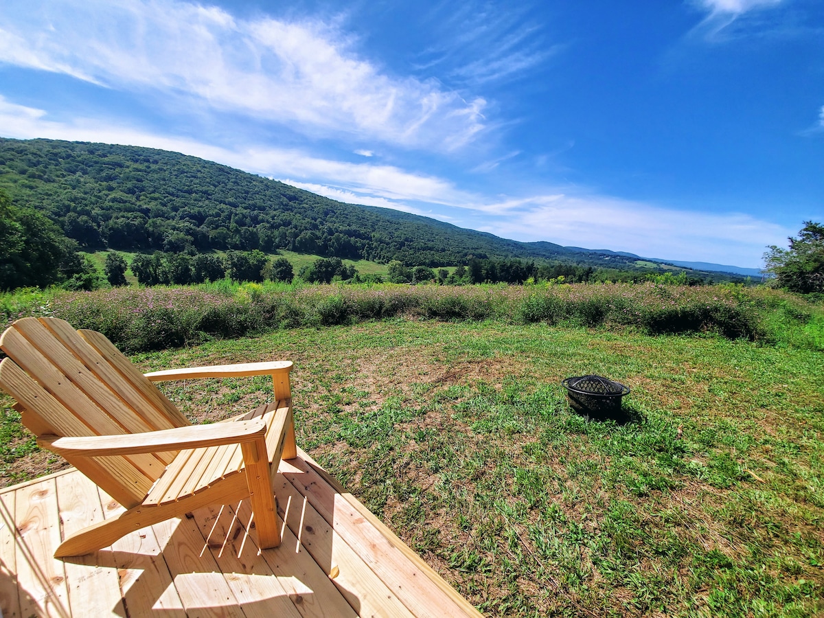 At the edge of a wildflower meadow with mountain views, this beautifully furnished glamping tent has two queen beds and private deck. Each of our four tents has a kitchenette in the Lodge, and there is a lovely Bath House. Enjoy wood-fired pizza (most but not all nights) and our new all natural wood hot tub (available for 1 hour private booking $25) 40 acres of meadows, woods, pond, streams and trails. Nightly bonfires and star gazing, a nearby lake and rafting in the Hudson River below.
