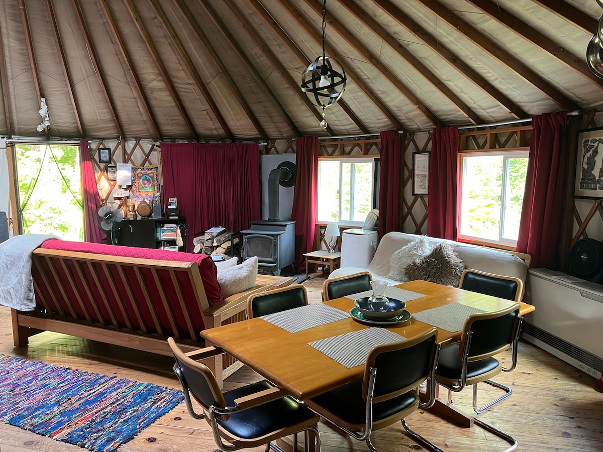 The Yurt In The Woods is 30 ft in diameter - 700 spacious sq. ft. It's surrounded by trees and has a yard. 2 night stays required for Weekends. October 6th and 12th are currently vacant if you want a fall foliage trip. There is a "one" night stay fee of $50 Allowed 2 dogs with the agreement to my animal policy & $50 fee WiFi 1,000 megabits per second a fiber network Outdoor Gas Grill , Outdoor Fire Circle, and Outdoor Shower available May - October