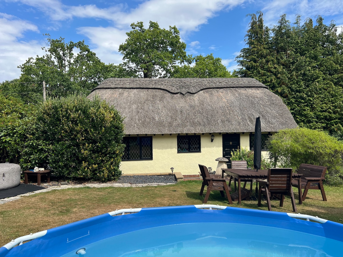 位于宁静的新森林环境中的漂亮的茅草小屋