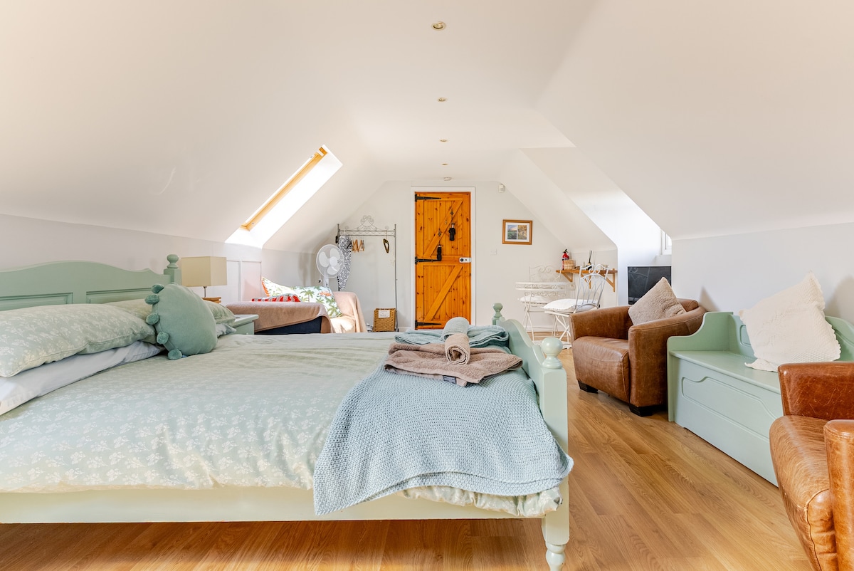 Accessed by an outside wooden staircase, the Sail Loft has a very large window providing wonderful views across the water meadows of the River Avon. This is a lovely, light-filled but cosy large studio room. There’s a kitchenette and a woodburner for those winter evenings, and we’re on the edge of the New Forest with lots of beautiful walks and cycling routes all year round. There are so many good pubs locally, and we are also only a half-hour drive from the South coast and its beaches.