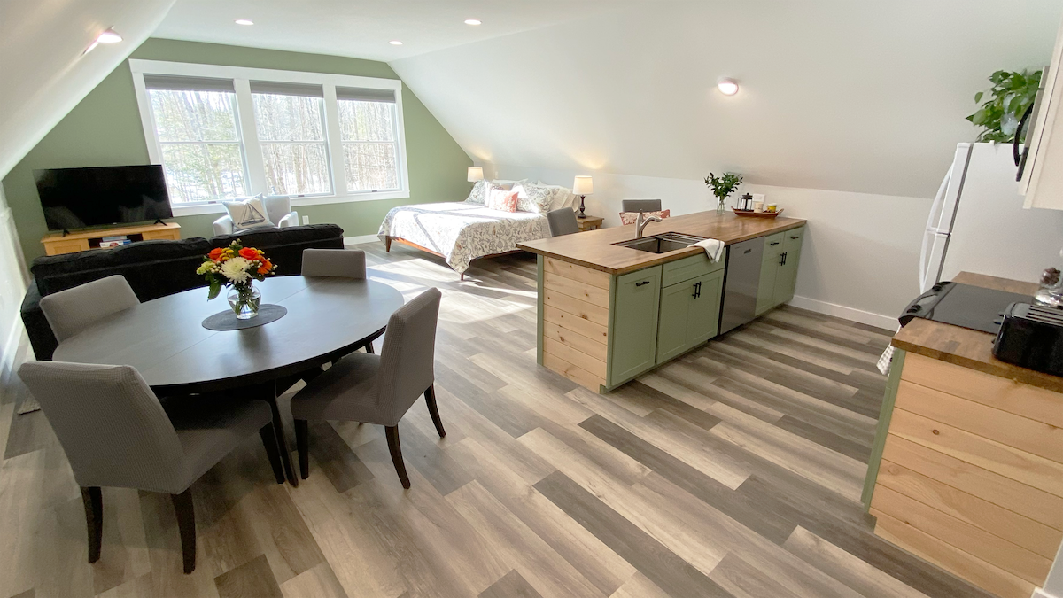 Solar suite on conservation property offers peaceful getaway. Large sitting room furnished with contemporary sofa, reading area, bedroom nook with natural latex Queen mattress on Japanese platform, kitchen island/toaster oven, mini fridge, dishes, silverware, linen napkins (please note this is not a full kitchen for preparing meals) private bath/shower. On the lower level of our home with private entrance. Cedar hot tub available.