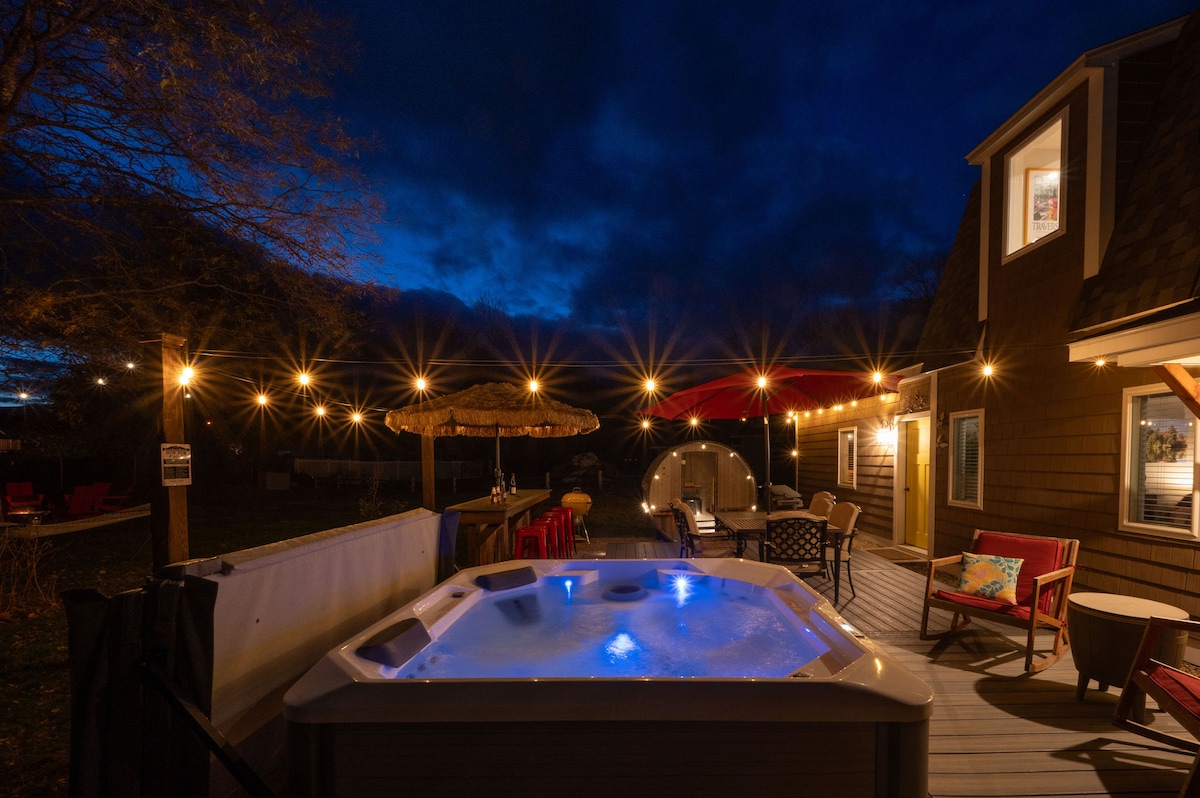 Escape to a peaceful, lakeside retreat with a secluded sun-lit deck and private dock with incredible views of Sunrise Lake, plus a 4-person hot tub, and seasonal amenities like a pedal boat, two kayaks, a SUP board, gas fire table, central A/C, a pellet stove, and snowshoes. Enjoy nearby activities like hiking, leaf peeping, skiing, and visiting scenic towns, local vineyards and breweries — or simply relaxing in a beautiful lakefront setting. The sunsets can be unbelievable!
