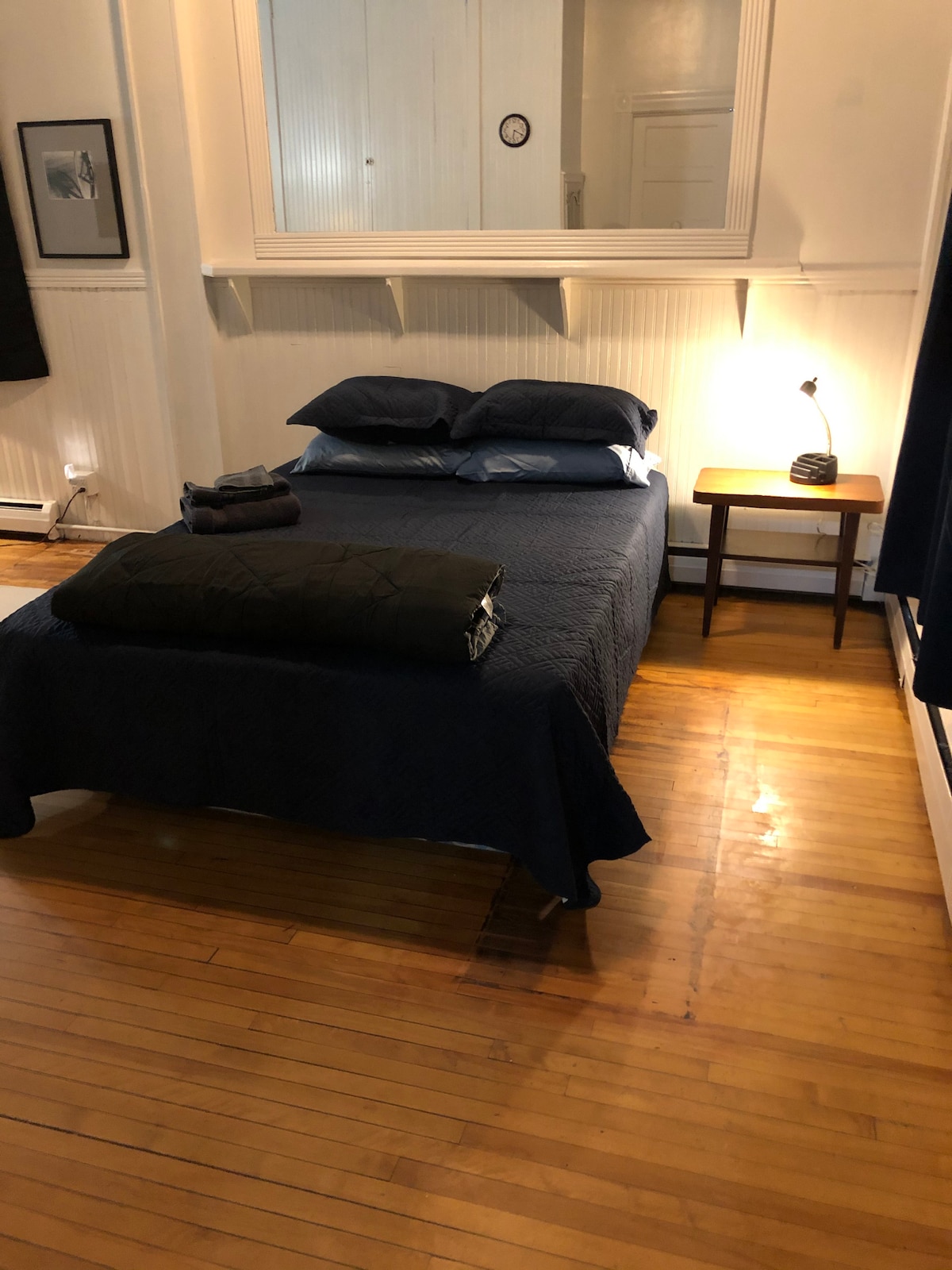 Small bedroom located within the owner's apartment behind art gallery business. What you get is a clean comfortable bed. Small but manageable. Good for a younger single adult on a thrift budget, the owner is very personable. non-smoker only. 2 cat roam through space. Will have full use of living space. street parking in front of the building, ask about limited on-premise parking. The room is set off in a private layout with a bi-fold door non-secure.