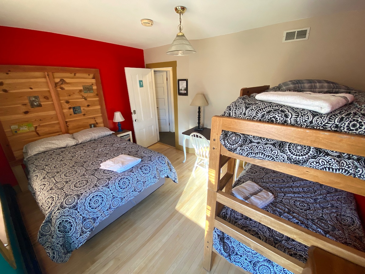 This is the largest room available in the Hostel. Features a queen bed and a single bed. Must climb stairs. Located on the second floor of the hostel. The kitchen and 3 baths share other guest rooms and dormitory space, minimizing how many people have access. For larger parties of up to 9 persons, book room number 12 (you will need to contact the host directly about reserving 3 people in the dorm room), and you will have the entire second floor. Note the winter parking policy.