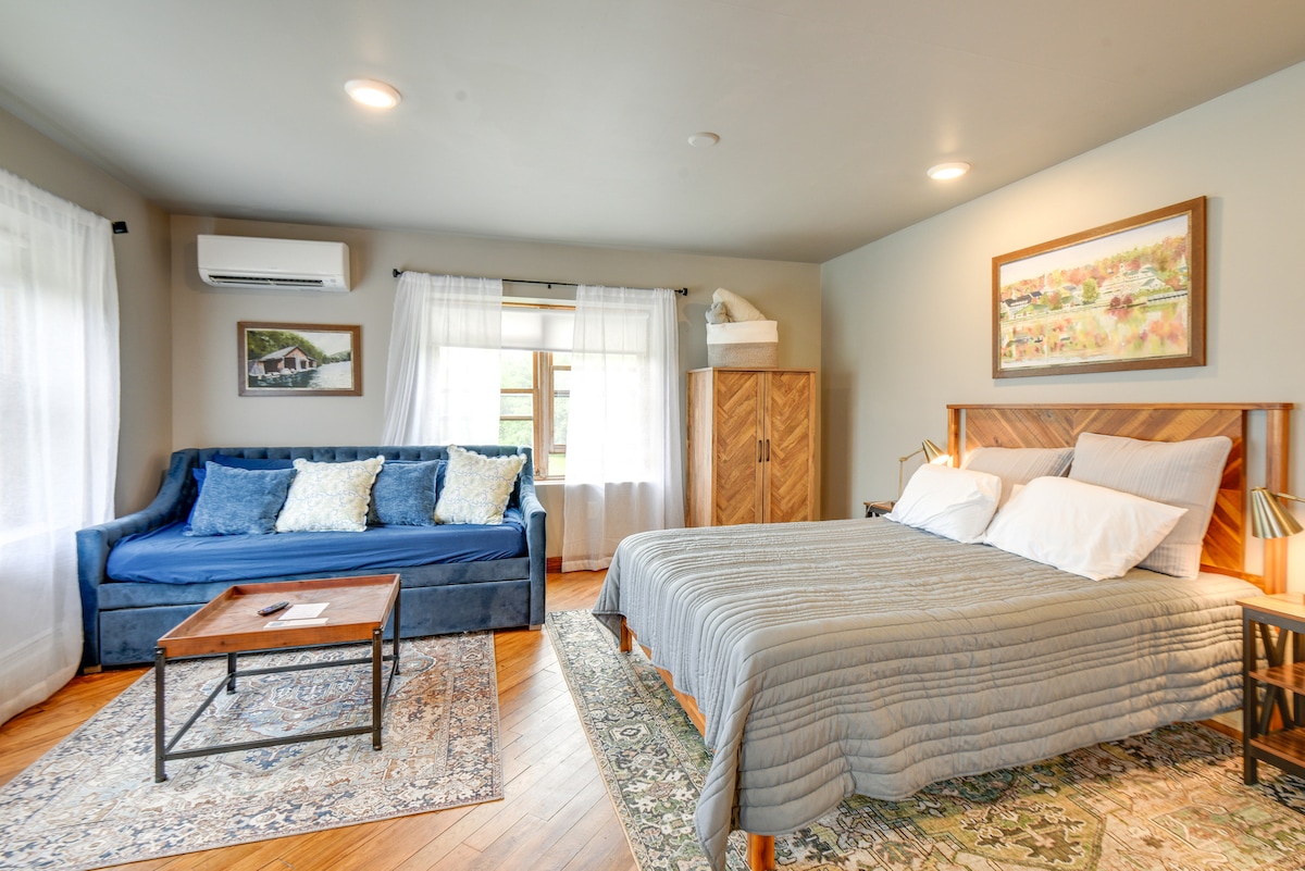 In the heart of Sunapee Harbor is “Topside”, a charming suite for guests who want to engage in the active Sunapee life. Topside is perfect for 2 people and cozy for 4. An efficient use of space offers a queen-sized bed, pull out love seat couch, single air mattress, kitchenette stocked with breakfast foods, snacks and basic cooking needs, private bathroom, Wi-Fi, Smart TV, board games, and your own tree-top deck. Very clean, stylish, and comfortable!