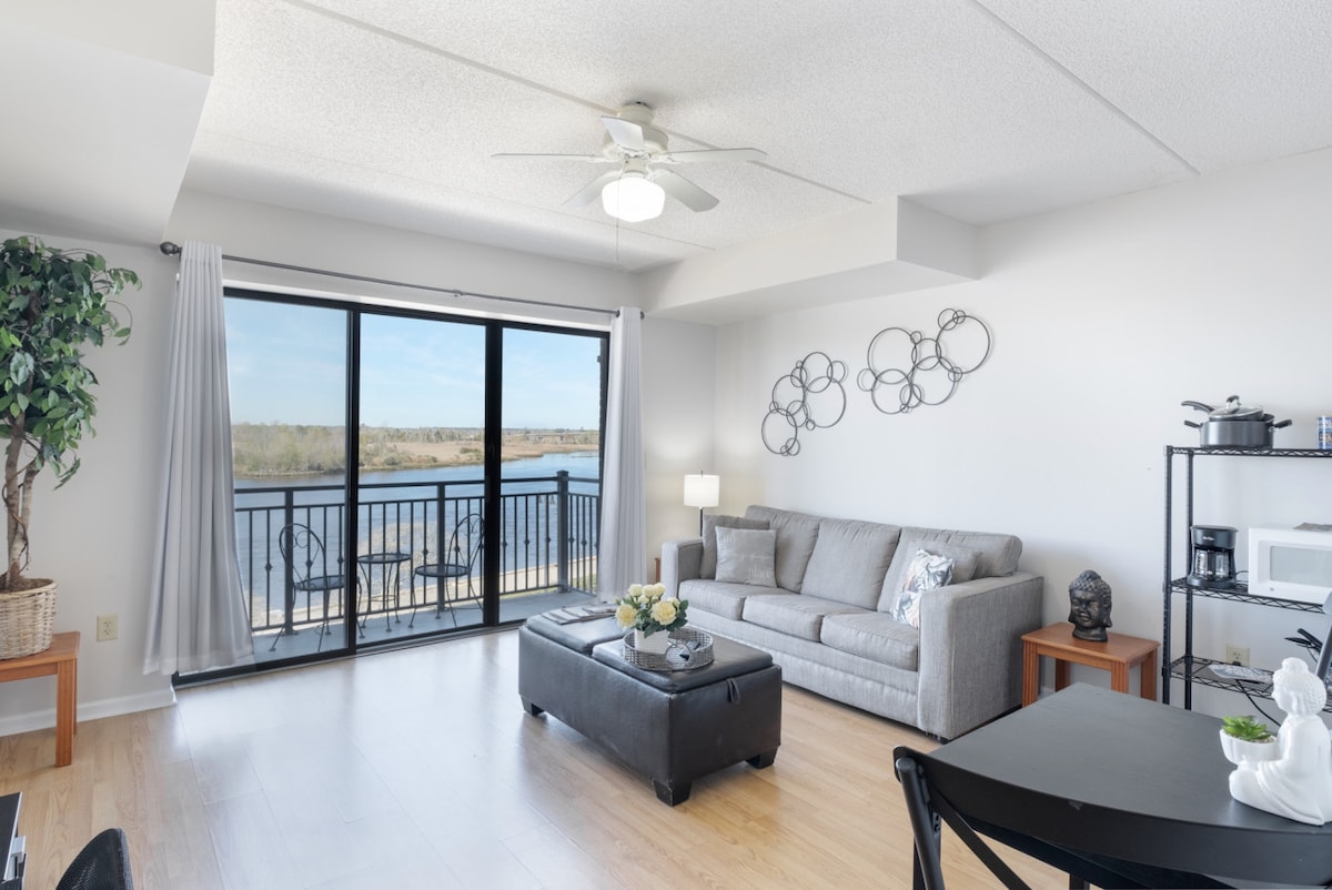 Private Downtown 1BR Condo on the 5th Floor with Private Balcony, River & Battleship Views, and On-Site Parking Close to UNCW, Live Oak Bank Pavilion, Wilmington Convention Center, and the Beach ★ “Great location, amazing views, perfect host.” ☞ Private balcony with outdoor seating ☞ River & Battleship NORTH CAROLINA views ☞ Fully stocked kitchenette ☞ On-site private parking (1 car) ☞ On-site washer & dryer ☞ Dedicated workspace ☞ 2 Smart TVs ☞ Fast WiFi (240 Mbps)