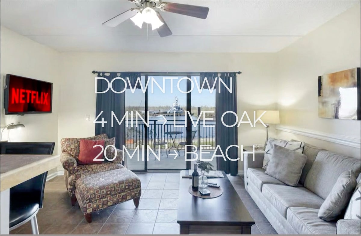 Private 4th floor condo w/ balcony + parking in the heart of downtown, close to UNCW & the beach. ★ "Great location; immaculate. Really enjoyed our stay" ☞ Private balcony w/ outdoor seating ☞ Fully stocked + equipped kitchenette ☞ Off site garaged parking (1 car) ☞ Onsite washer + dryer ☞ Dedicated workspace ☞ Smart TVs (2) ☞ 270 Mbps WiFi 4 minutes → Live Oak Bank Pavilion 20 minutes → beach ★ "Clean and comfortable, walking distance to restaurants , beautiful view!”